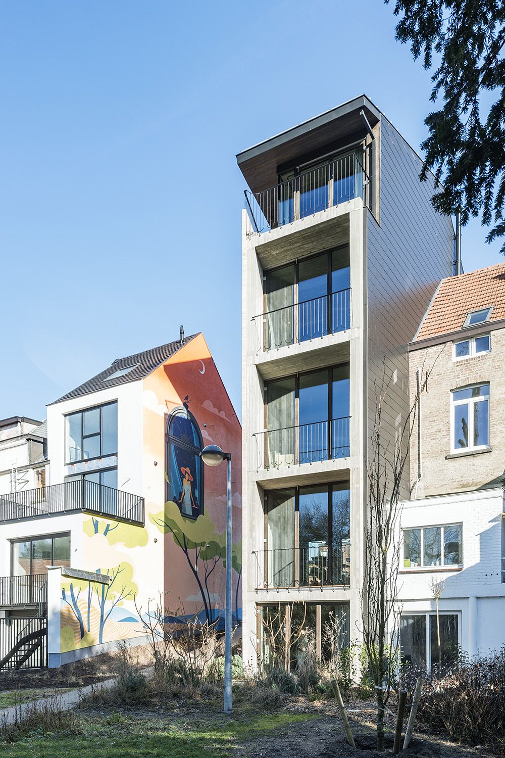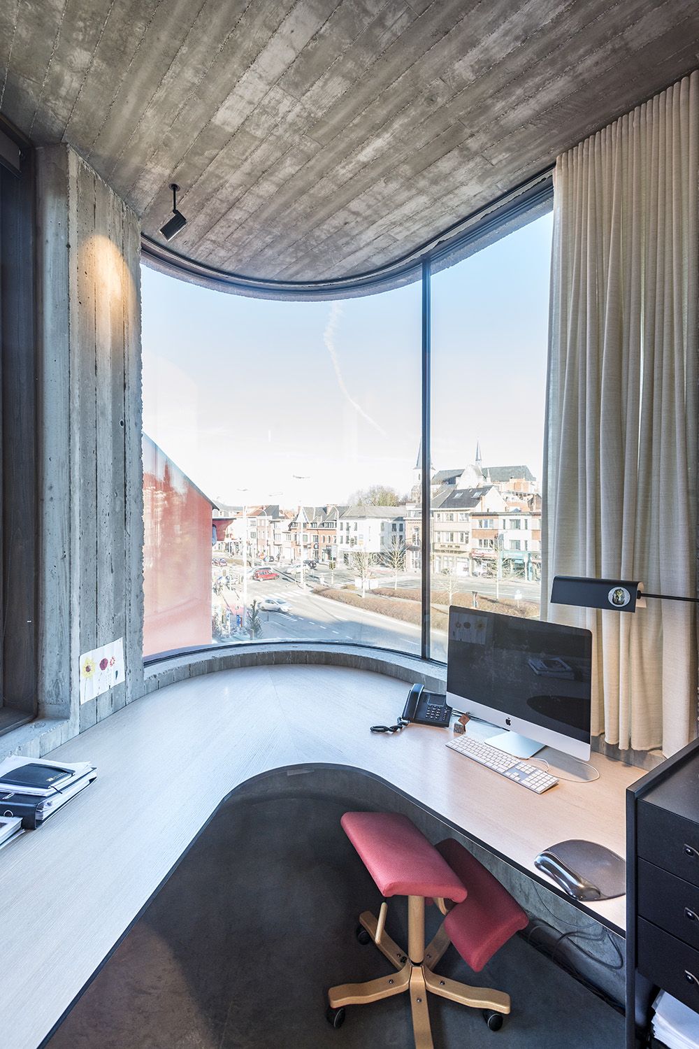 “Hoewel niemand stond te springen om iets met het perceeltje aan te vangen, bleek het - toen ik mijn interesse in de grond kenbaar maakte - toch niet zo evident om er een gebouw met een woonstudio op tuinniveau - dat één verdieping onder straatniveau ligt - en vier verdiepingen kantoorruimte, te realiseren”, begint Denef te vertellen. “In het Bijzonder Plan van Aanleg is het terrein immers ingekleurd als woonzone. Gelukkig werd er uiteindelijk een uitzondering gemaakt.”