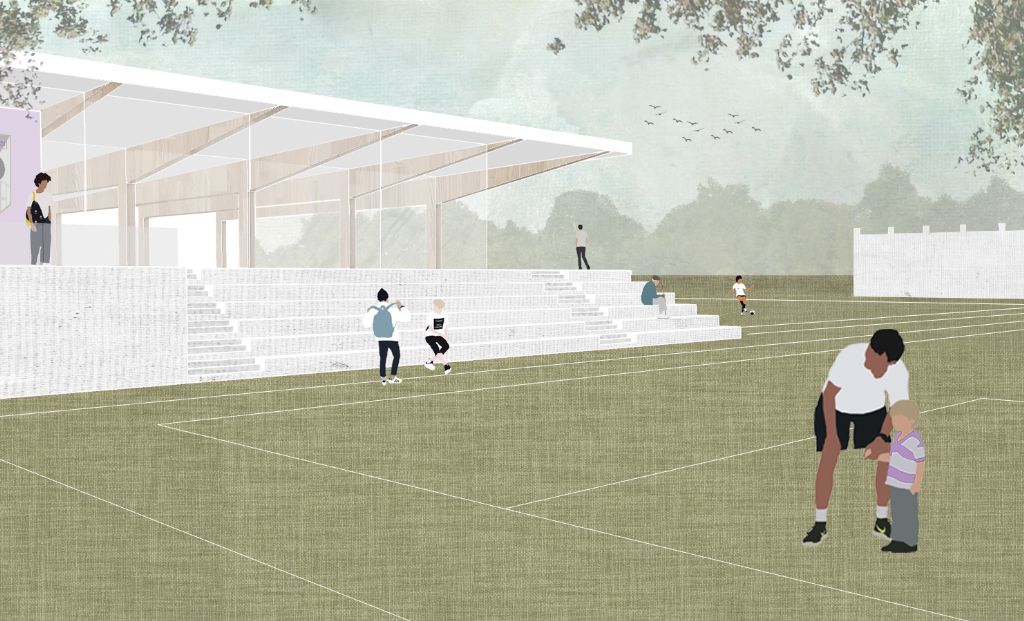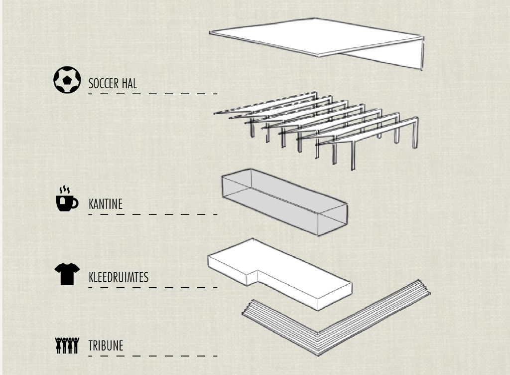 De inplanting van het nieuwe complex was volgens Deckers vanzelfsprekend. “Het gebouw komt tussen de drie bestaande voetbalvelden zodat men vanuit de kantine een optimaal uitzicht geniet op alle omringende terreinen. Die kantine komt logischerwijs bovenaan, en rust op een betonnen sokkel waarin de ruimtes voor de spelers worden ondergebracht. Samen met de tribune vormt die de basis van het bouwvolume. Tegen de rug komt de indoorhal, die ook inkijk geniet vanuit de kantine.”