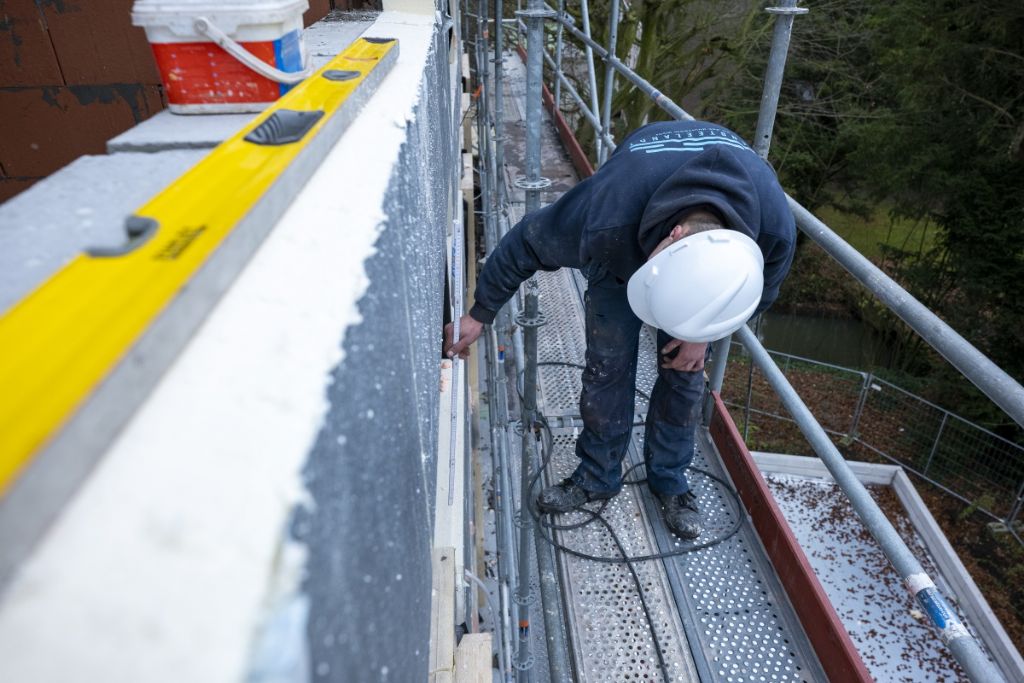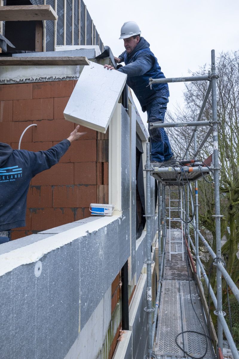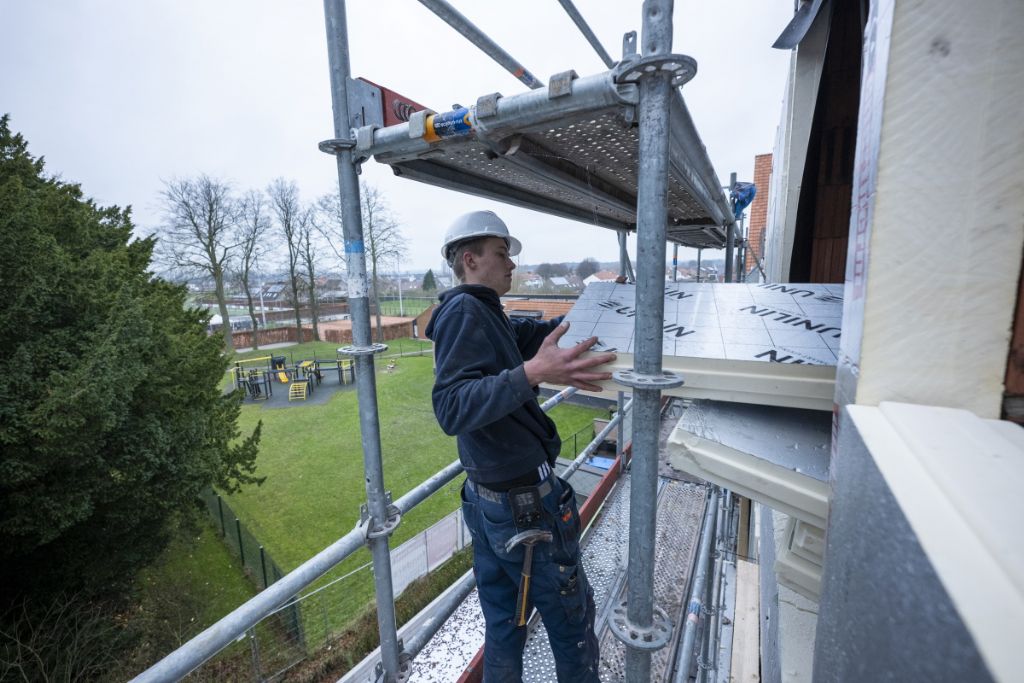 “Door de vele ramen is het een moeilijk gebouw, maar toch verloopt de plaatsing heel vlot. Het is wat meer werk dan gewoon ‘rechtdoor’ isoleren, maar het eindresultaat zal mooi zijn”, besluit Tom Vansteelandt.