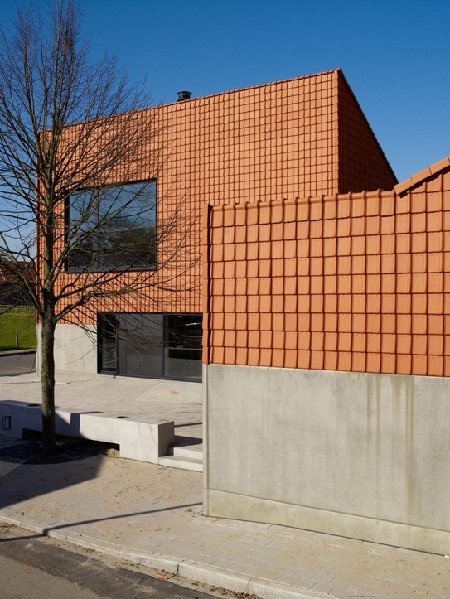 Qua materiaal heeft men geopteerd voor eenvoud. De basis van de constructie bestaat uit een eigentijdse staalstructuur die bekleed werd met sandwichpanelen in hout en isolatie. Deze werd bekleed met traditioneel modulair bouwmateriaal, namelijk stormpannen in rood gebakken aarde. De voet van het volume is afgelijnd met een beschermende plint in grijs sierbeton (een eigentijdse variant van plint in blauwe hardsteen). De maten van het gebouw en de gevelperforaties konden worden bepaald op basis van de module van de dakpannen en de achterliggende structuur in staal.