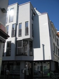 De eerste prijs tenslotte, ging naar het project “De Visbeuzze” op de Grote Markt nr. 10 in Halle en dus gelegen in het beschermde historische stadscentrum. Het programma omvat de nieuwbouw van 2 duplexappartementen en een commerciële ruimte op het gelijkvloers en werd uitgewerkt door arch. Jean-Pol Borremans van AROS. Voor de jury kan het ingediende project beschouwd worden als “een mooi voorbeeld dat een kleinschalig project , met een grondoppervlakte van slechts 37 vierkante meters, als vervanging van een pand als kind van zijn tijd, zowel in vormgeving, locatie, gevelgeleding, ritme, en materiaalgebruik autonoom is maar evenzeer harmoniërend. Het pleinbeeld wordt door de architecturale en stedenbouwkundige ingreep opnieuw gesloten. De bestaande betonconstructie die na ontmanteling opnieuw dienstig kon zijn, kan zeker bestempeld worden als duurzaamheid. Daarnaast past het ontwerp zich beter in in de hoogteprofielen dan het voormalige pand uit de jaren zestig/zeventig. Een meerwaarde voor de bouwheer, voor de Grote Markt en voor de stad Halle.”