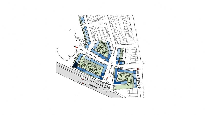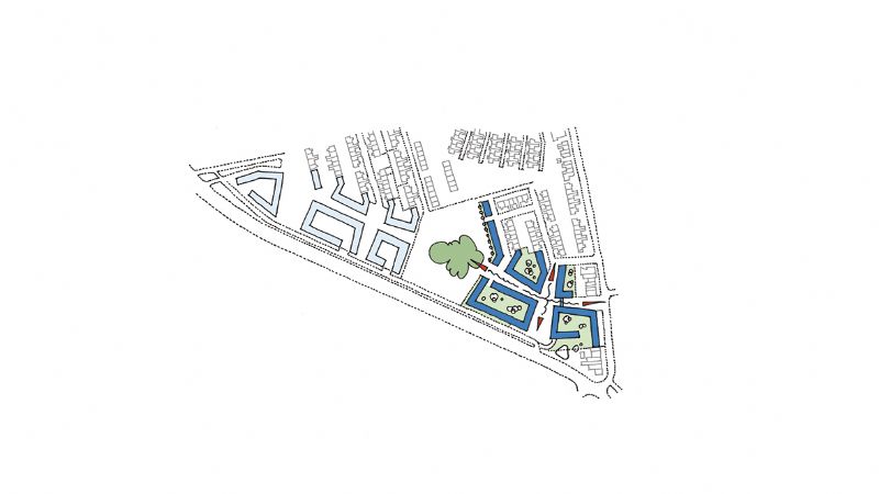 Verschillende typologieën worden in gesloten bouwblokken bijeengebracht, aansluitend bij de bestaande bebouwing. De onderlinge verschillen zijn subtiel genoeg om de wijkeenheid te bewaken en laten tegelijkertijd identificatie tussen bewoner en woning toe.