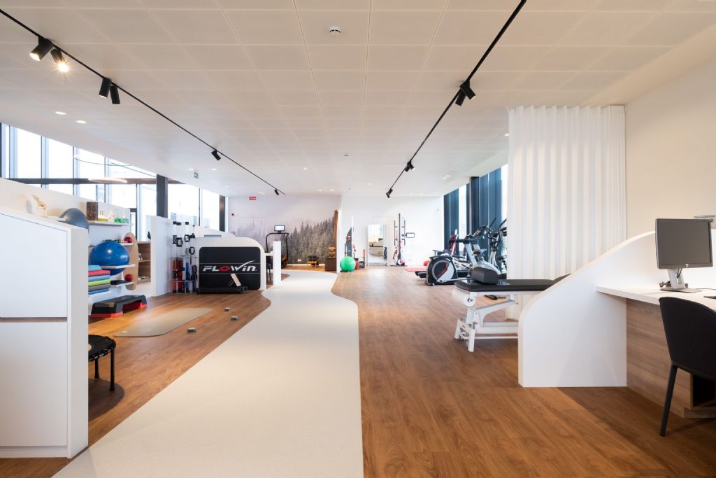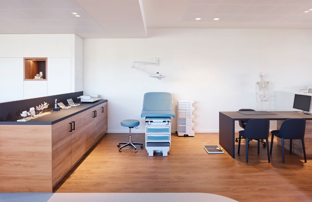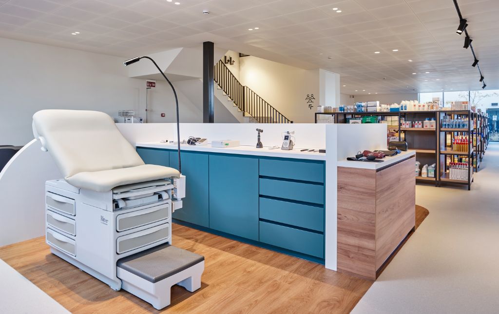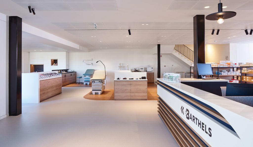 Op de gelijkvloers vind je, naast de ontvangst- en loungezone, ook de shop-in-shop en de belevingsshowroom van Gymna en Barthels Medical. In deze grote showroom wordt vinylvloer afgewisseld met gietvloer, het gevoel van een kabinet wordt hierdoor zo goed mogelijk nagebootst.