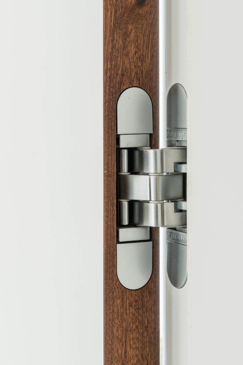 Het onzichtbare, aluminium deurkader zorgt er in combinatie met een pivotscharnier voor dat ook pivoterende binnendeuren tot 100 kg even strak ingewerkt kunnen worden. Omdat het pivotsysteem ingewerkt is in de deur in plaats van in de vloer, is dit invisidoor AX Pro systeem zowel voor nieuwbouw als renovatie een aan te raden oplossing, zeker bij vloerverwarming. De deur kan in beide richtingen open en blijft vast staan op 90°. Een actieve sluitdemping zorgt ervoor dat de deur bij het sluiten steeds terug op het nulpunt tot stilstand komt, in hetzelfde vlak als de wand.