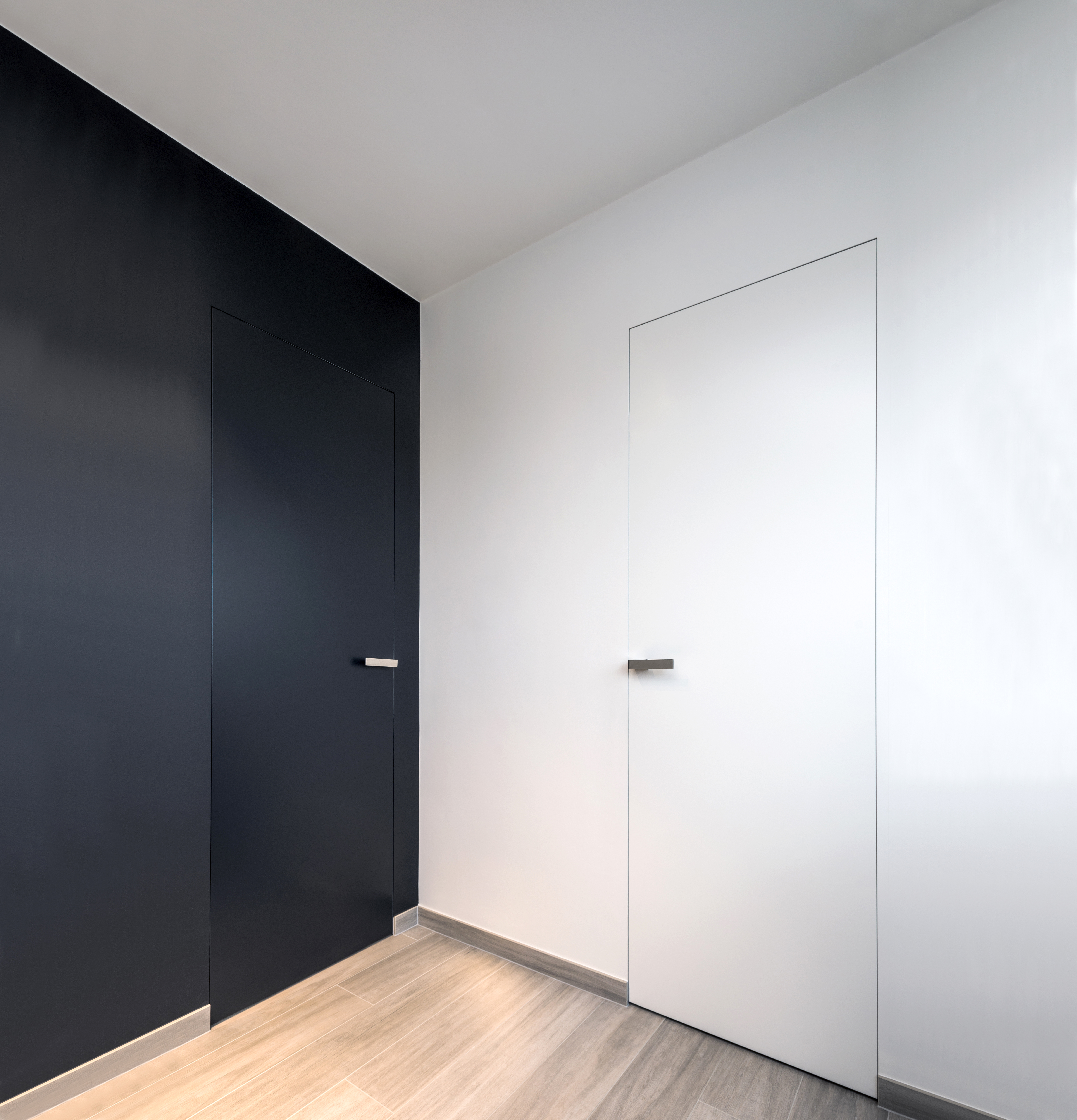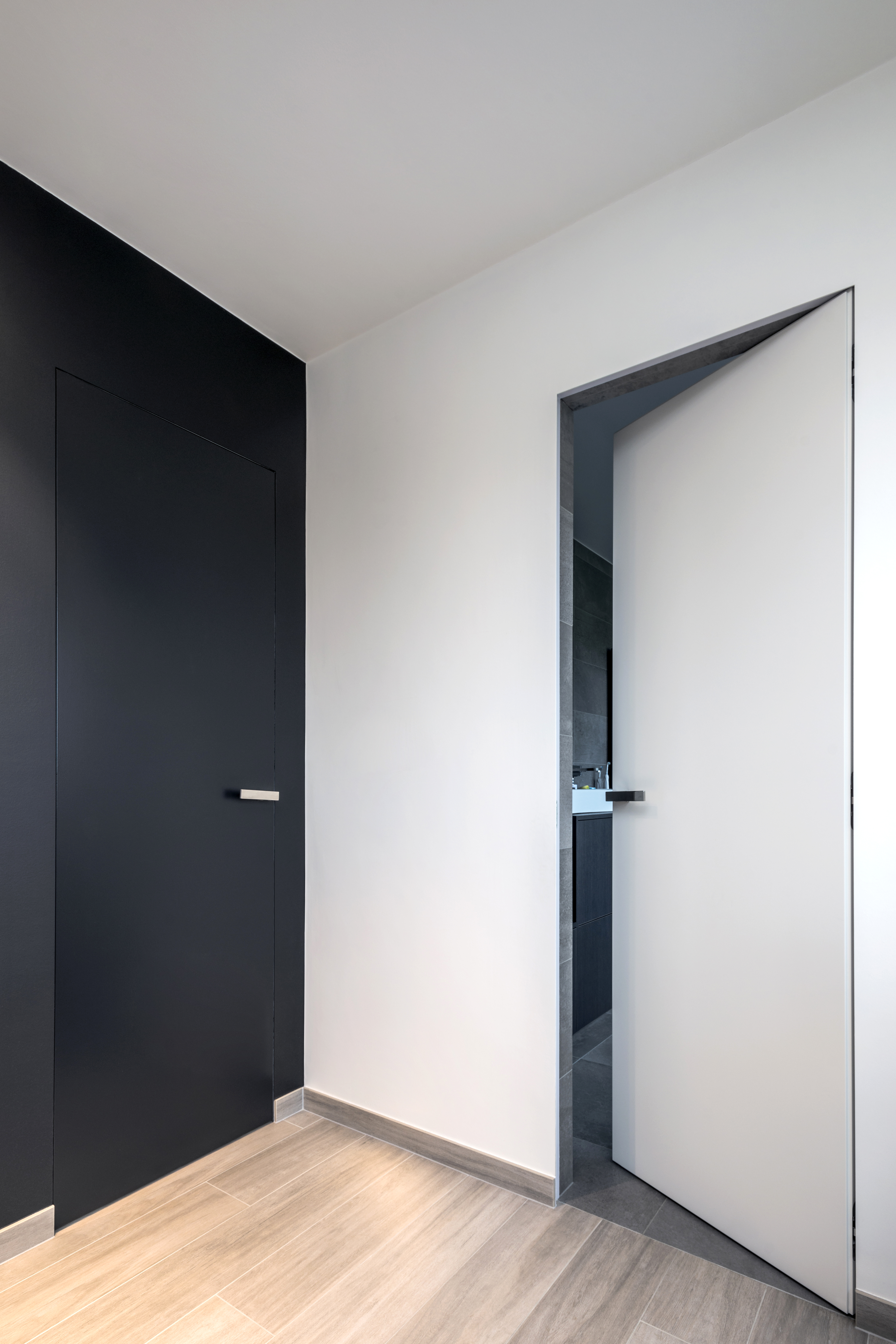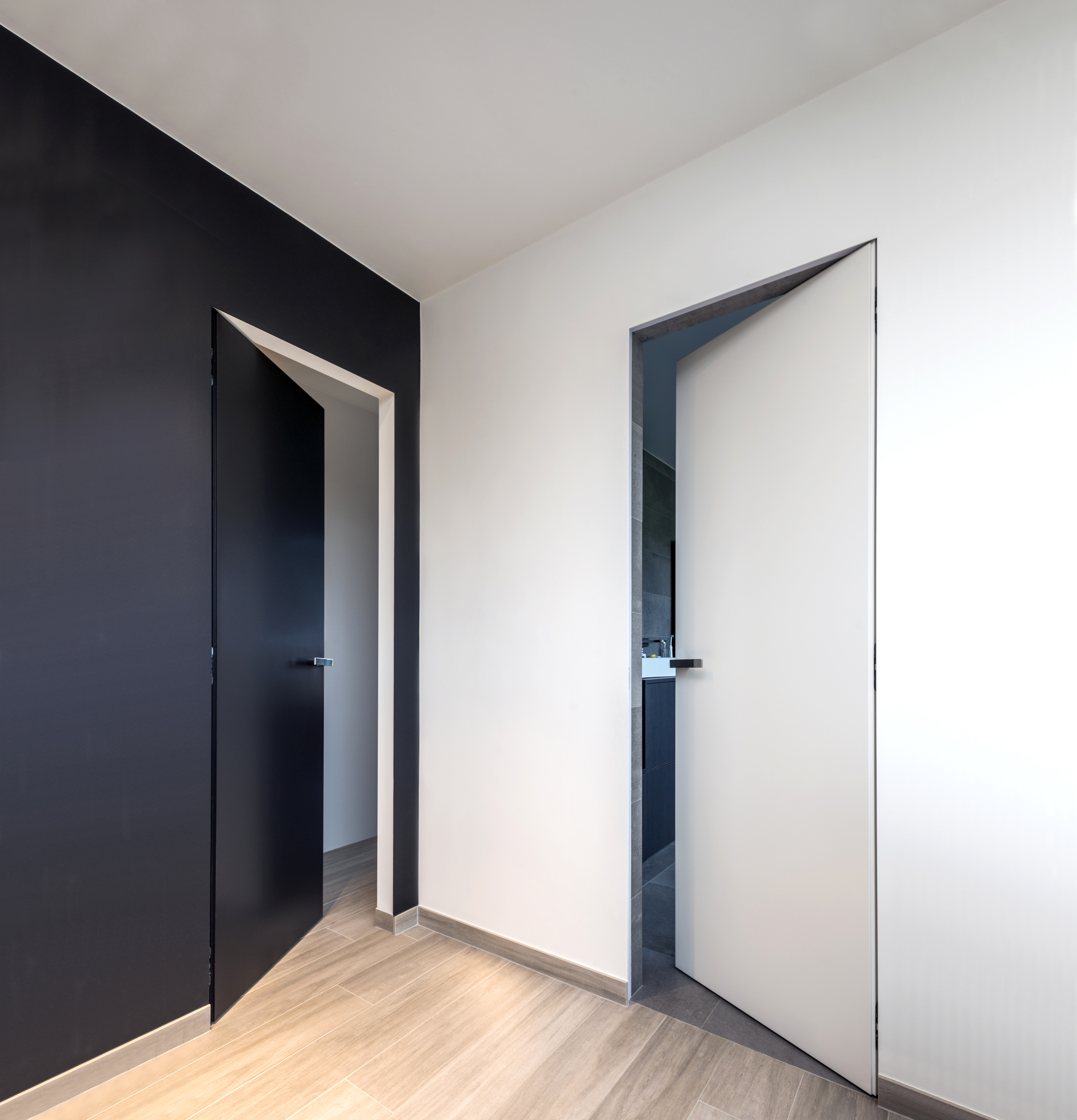 Opvullen tussen de adaptoren doe je door afdekprofielen in datzelfde U-profiel vast te klikken. De naad die zichtbaar blijft, kan je naar wens nog afkitten en vlak schuren. Zelfs na installatie is het nog steeds mogelijk om de scharnier- en slotkant van een Invisidoor 2.0 binnendeurkader om te wisselen zonder te moeten demonteren. Of een deur links of rechts moet opendraaien, hoef je dus niet op voorhand uit te maken. Ook een extra scharnier of ingebouwde deurdranger voorzien is perfect mogelijk na plaatsing.