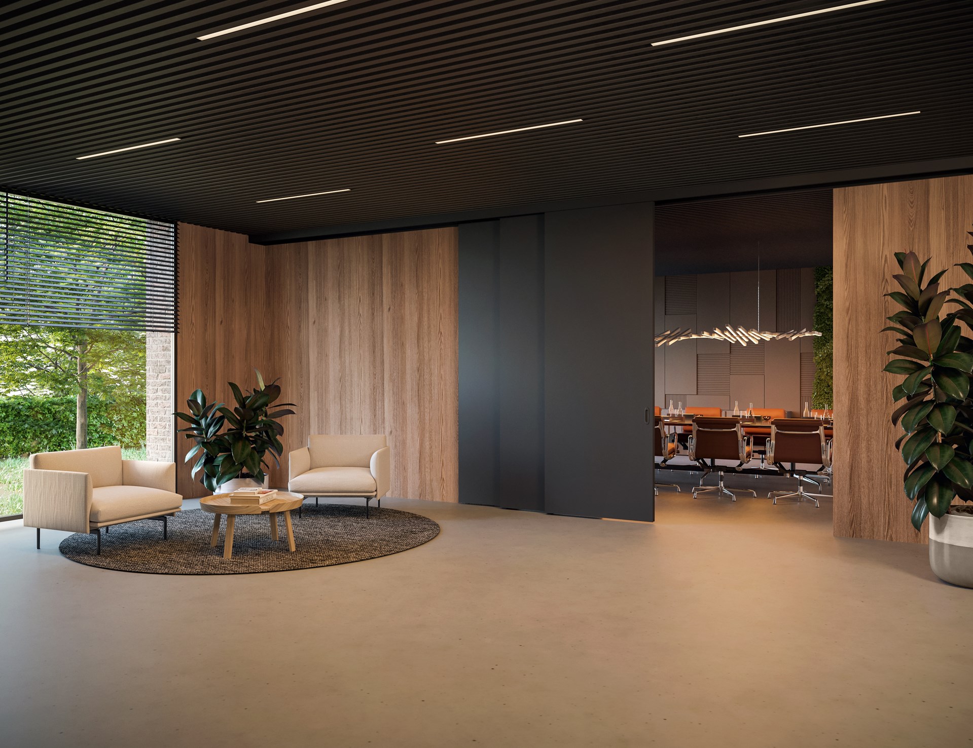 Glazen scheidingswanden worden pas echt interessant om een interieur op te delen als je er ook een deur kan in verwerken. Met ‘Slide’ heeft divina een glazen schuifdeur in lijn met de ‘steel look’ glaswand in strakke aluminium profielen. Met het loopprofiel ingewerkt in het plafond, een onzichtbare ondergeleider en profielen die exact even breed zijn als die van de divina glaswand, zit de Slide schuifdeur daarin naadloos – en met slechts 5 mm speling tussen wand en deur – geïntegreerd. De profielen voor deze schuifdeur passen voor zowel gehard glas van 8 of 10 mm als voor gelaagd glas van 44.2 of 55.2 mm. Met het glas rondom in de profielen vastgeklemd, kan je rekenen op een super sterke verbinding tussen de profielen en de rolstelsels. En aangezien het glas niet verlijmd wordt, is ook vervangen kinderspel. Leuk weetje: de divina Slide schuifdeur kan je – naast de divina wand – combineren met eender welke andere wand. Divina Slide is beschikbaar met profielen in zwart, wit en grijs.