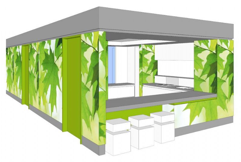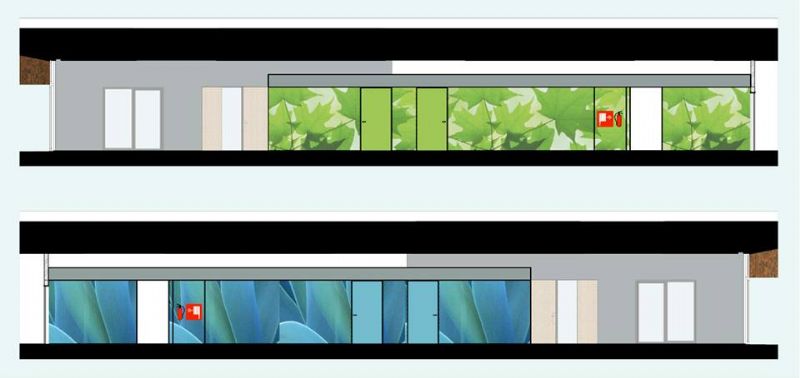 In de verhoogde middenzone onder de U-vormige overkapping worden de gemeenschappelijke functionaliteiten ondergebracht in speelse en aan de bewoners aangepaste containerblokken. De openheid en geslotenheid van deze vrijstaande containerblokken evenals de speelsheid van kleurgebruik en wandtextuur worden per leefgroep aan de specifieke bewonerseisen aangepast.
