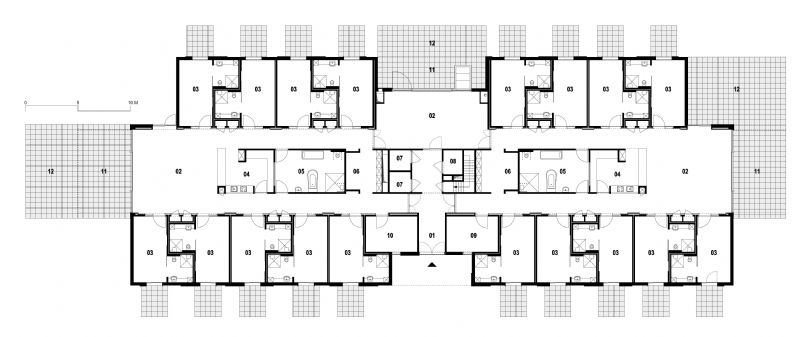 De studio`s worden samengebracht in leefgroepen van telkens 9 personen. De privatieve ruimten worden gegroepeerd in balkvormige volumes die tegenover mekaar worden opgesteld en zo de sokkel vormen voor de overdekking van de tussenliggende gemeenschappelijke ruimten. De leefgroepen worden lateraal per twee in één gebouw geplaatst met op het raakpunt een inkom en extra leefruimte.