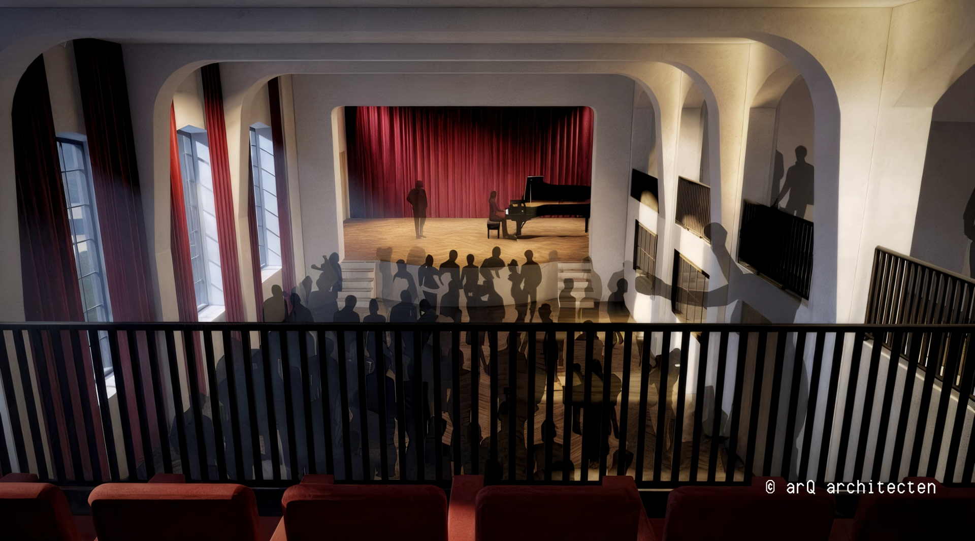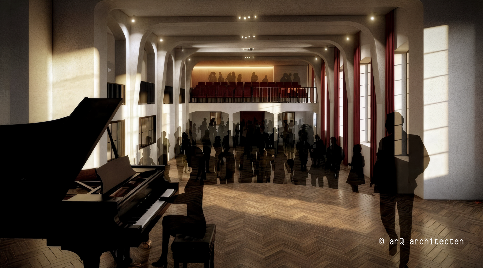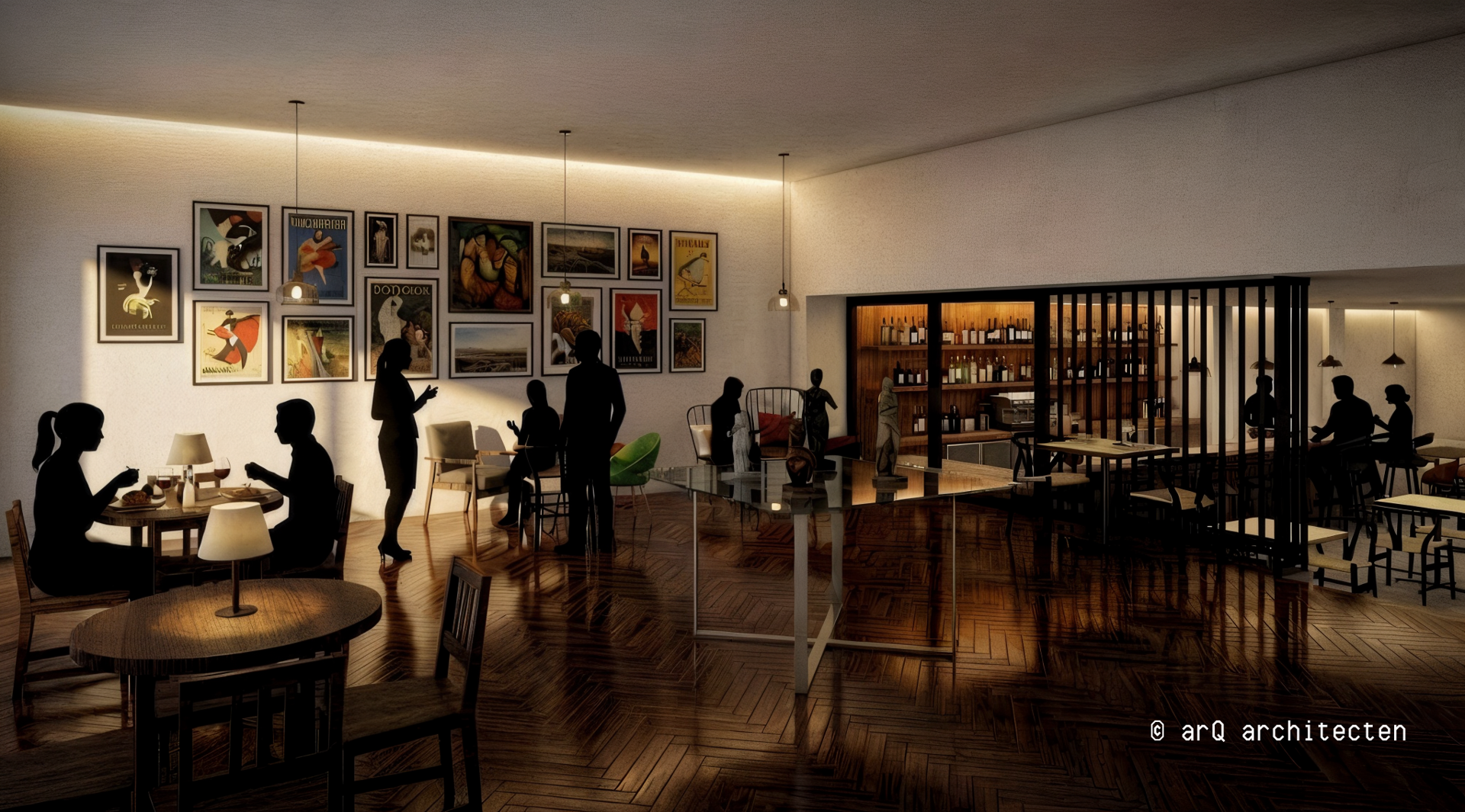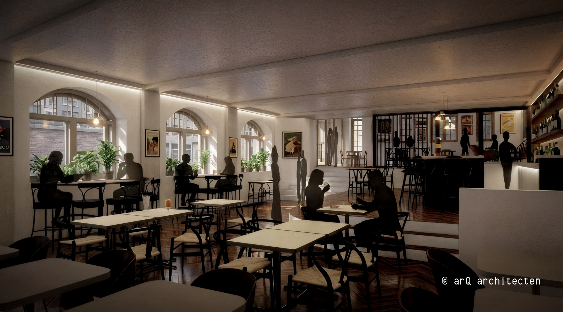 Architecturaal kiest arQ architecten voor een terughoudende strategie. Het bestaande gebouw en zijn indeling vormen het uitgangspunt, waarbij ingrepen bewust beperkt blijven. In plaats van ingrijpende volumewijzigingen wordt gewerkt met gerichte aanpassingen die de nieuwe functies mogelijk maken zonder het karakter van het pand te verstoren.