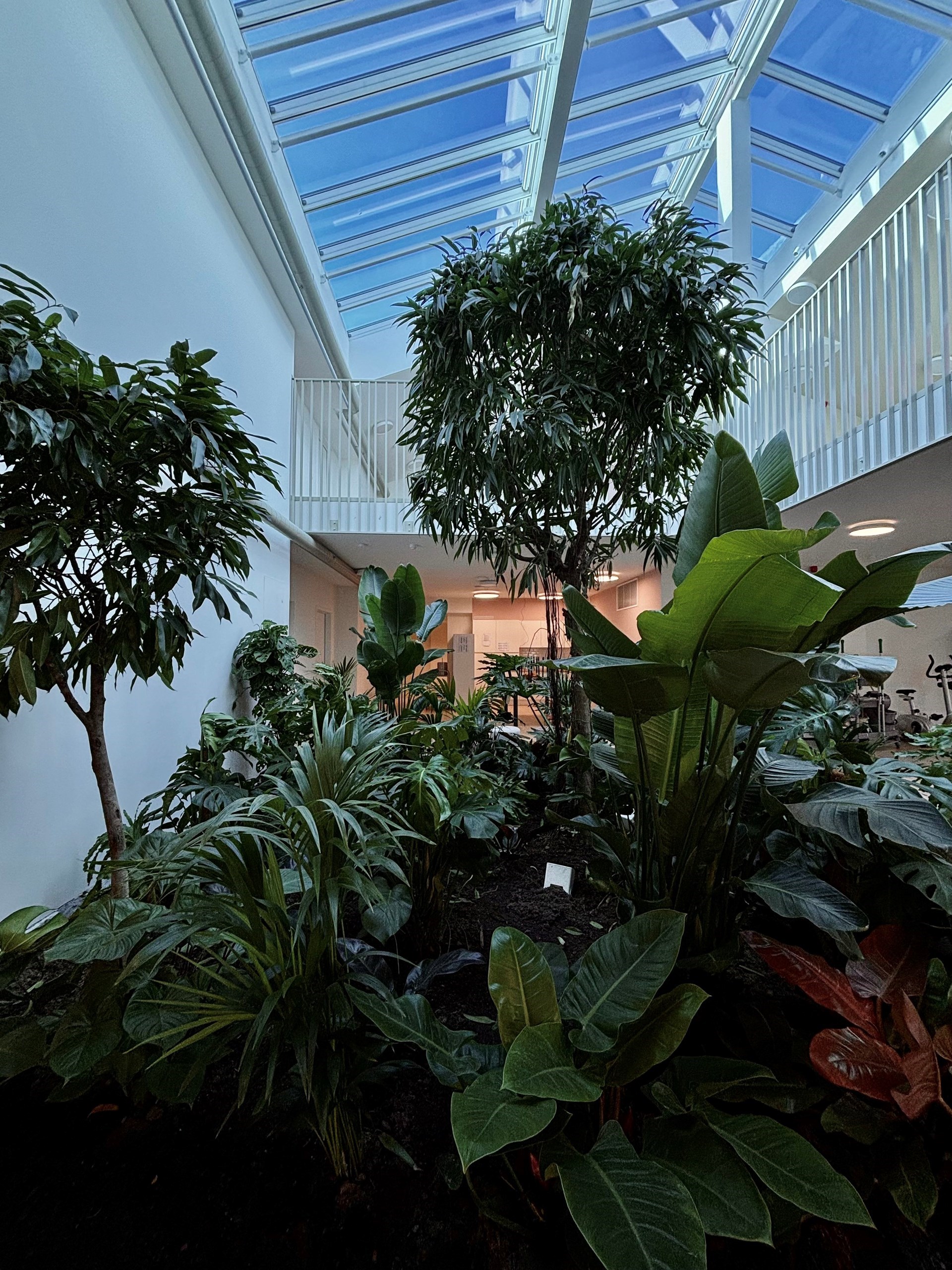 Centraal in het complex bevindt zich een opvallende 'wintertuin', een binnentuin die dient als natuurlijke buffer tussen de verschillende woon- en slaapkamers. Het natuurlijke daglicht dat door de schuine dakramen binnenvalt, gecombineerd met de groene omgeving rondom het gebouw, zorgt voor een rustgevende sfeer. De open indeling van de ruimtes, samen met comfortabele privékamers, wordt zowel door het personeel als de bewoners hoog gewaardeerd vanwege de ideale balans die het biedt.