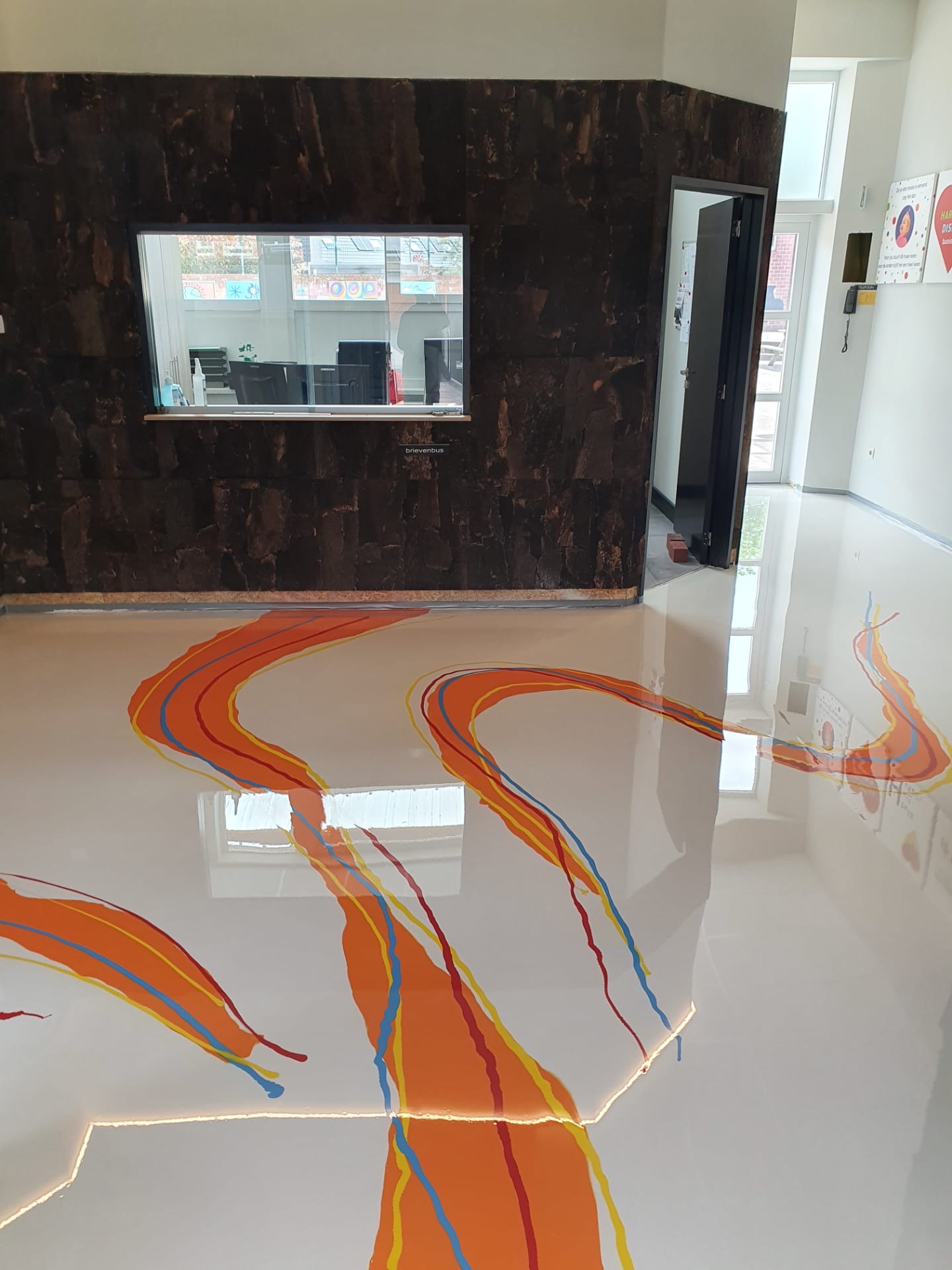 De inkomhal moest het visitekaartje van de basisschool worden. Na wat getouwtrek kwamen Arturo Studio en directeur Peter Savels tot een akkoord over het ontwerp. “Ik heb uiteindelijk gekozen voor organische vormen waarmee ik een wegwijzer in de entree van de school kon weergeven”, vertelt Thea Kruders van Arturo Studio. “Op vlak van kleuren heb ik me gebaseerd op de warme kleuren uit het logo van de school. De lichte basis gietvloer in de kleur Cotton White in combinatie met het warme zonnige oranje zorgen voor een warm en speels effect. Voor de lijnen is gekozen voor de primaire kleuren geel, rood en blauw.”
