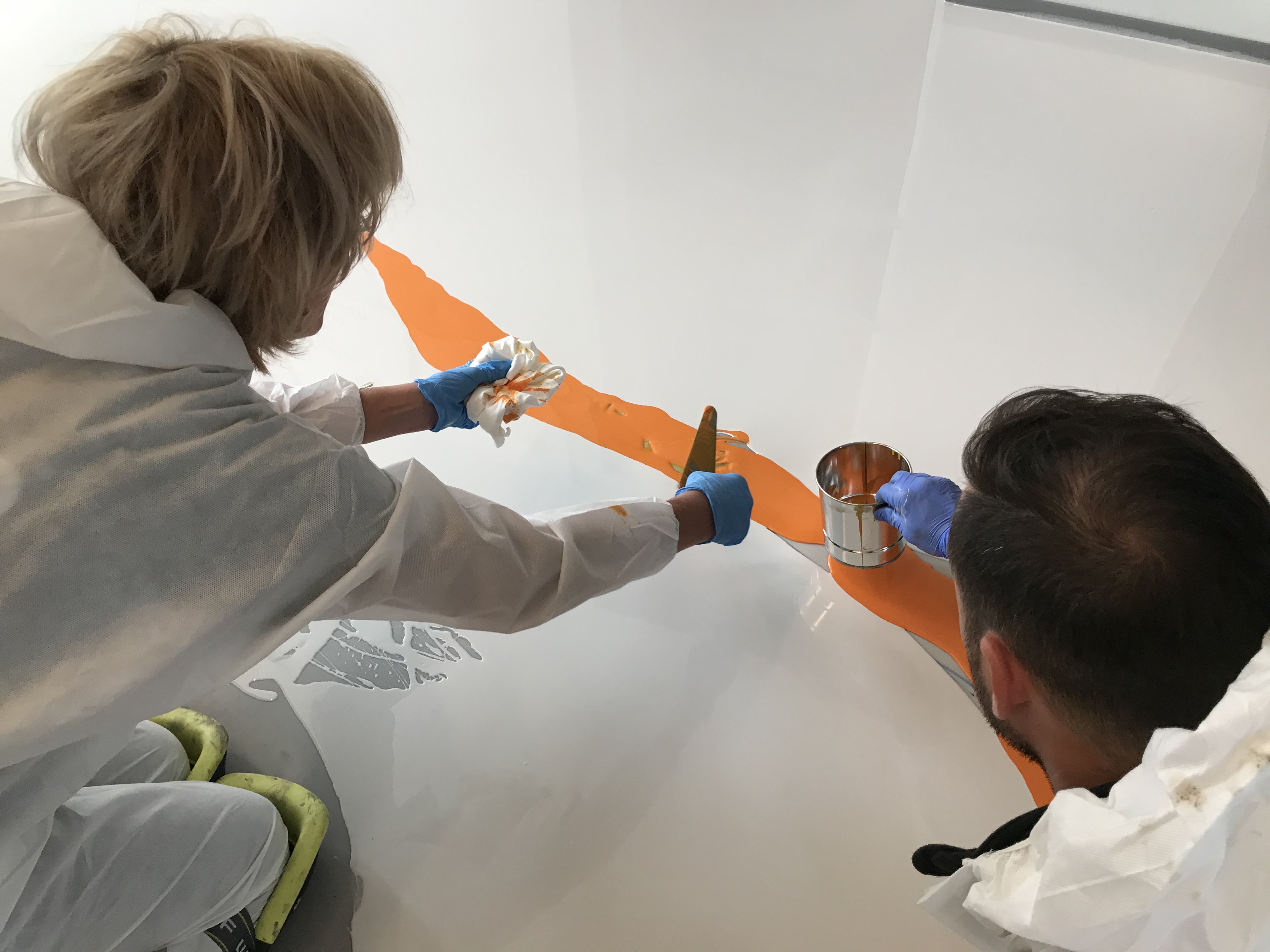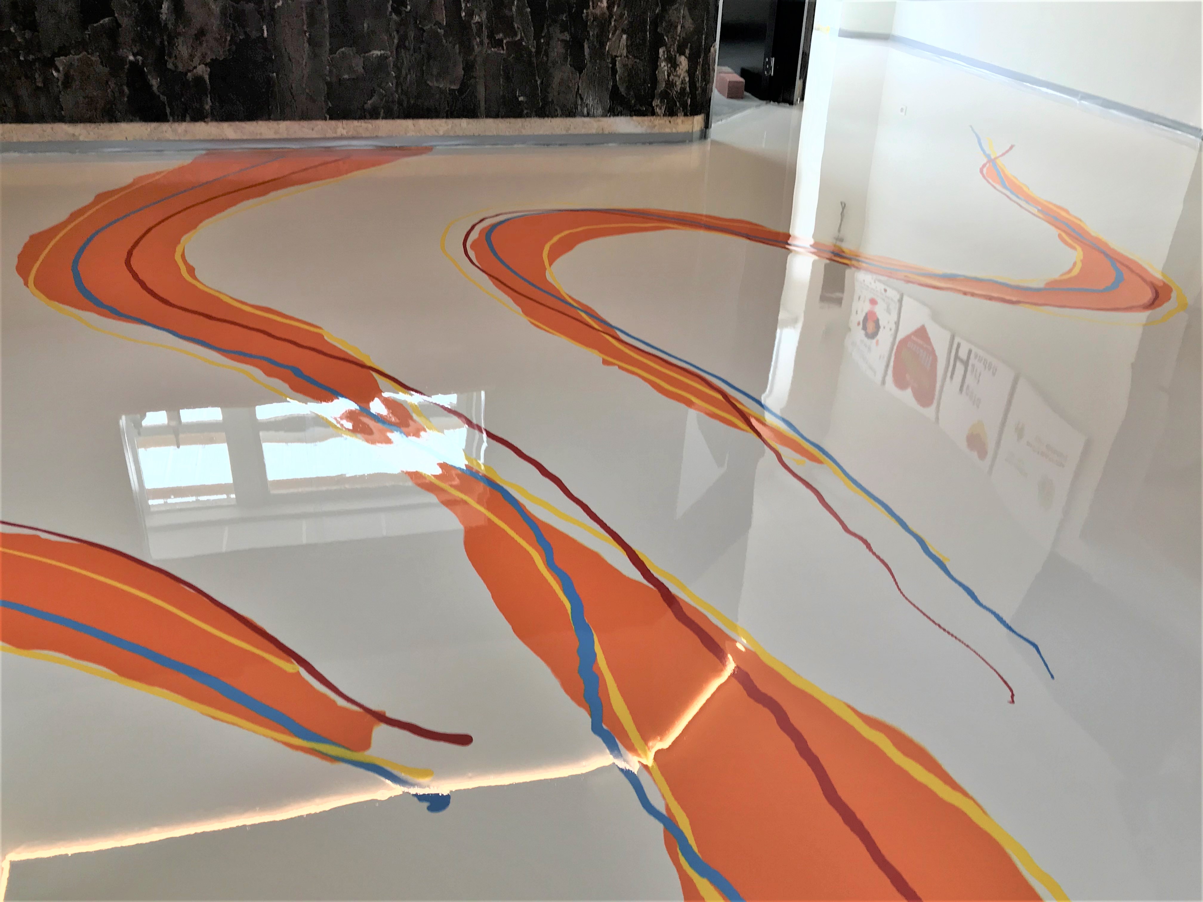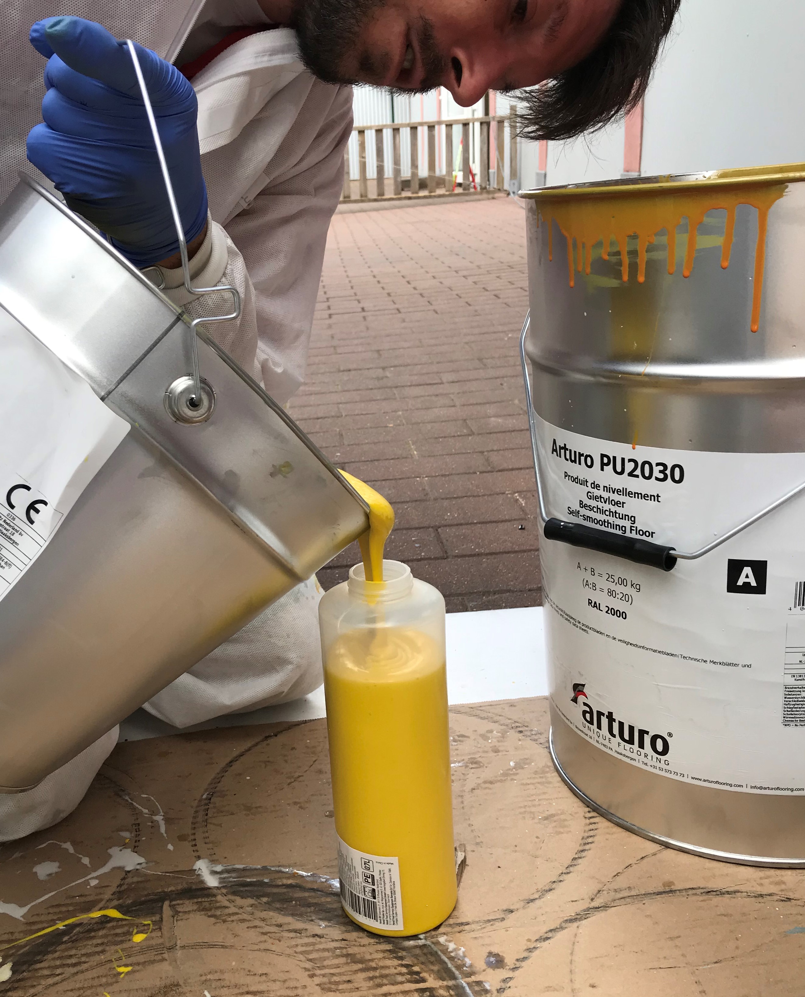 Voor Liquid-Art was de uitvoering van het ontwerp niet makkelijk. “Het was voor ons niet alleen de eerste keer dat we met Arturo Studio samenwerkten, maar ook de eerste keer dat we een PU-kunstharsvloer moesten plaatsen met verschillende kleuren door elkaar”, zegt Vanden Eynden. Voor de plaatsing van de vloer maakte de firma uit Roeselare gebruik van een nat-in-nattechniek. Bij zo’n techniek zijn er verschillende kleuren die binnen het halfuur min of meer tegelijk aangebracht dienen te worden. “Ik was alvast erg blij dat Thea Kruders er was om aan te geven wanneer we welke kleuren moesten mengen en aanbrengen”, geeft Vanden Eynden toe.
