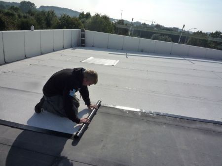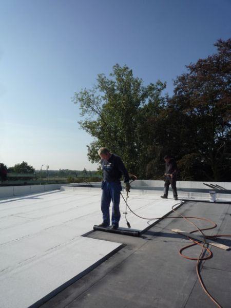 Links de dakopbouw met de IKO-enertherm ALU, rechts de plaatsing van de Polygum Carrara