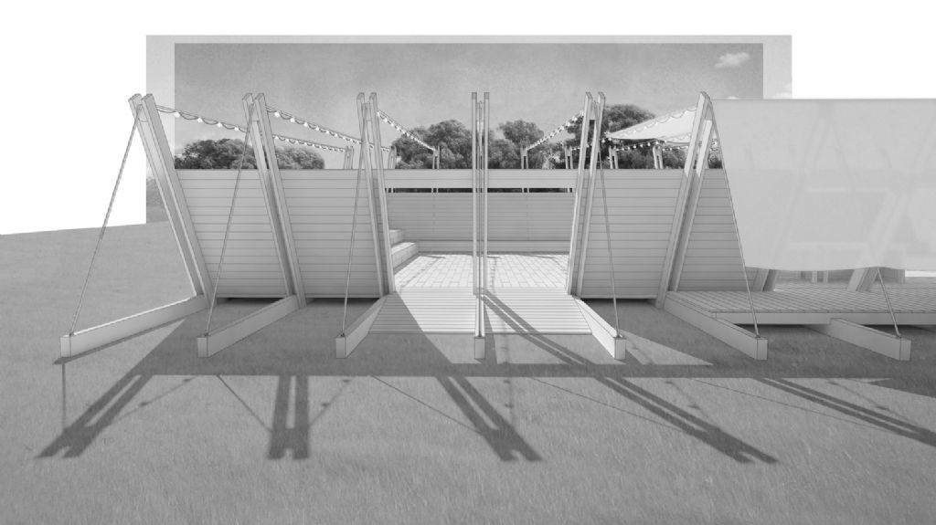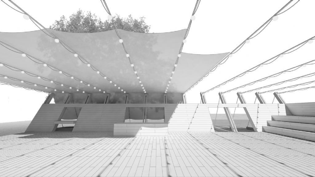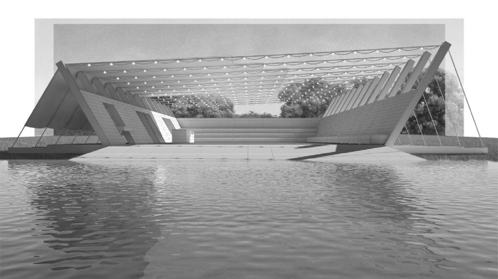 Spanningskabels verbinden de wanden langs beide zijden van het paviljoen en creëren een immaterieel dak dat lijkt op te gaan in de horizon. Het podium strekt zich uit vanop een platform ondergedompeld in water, net zoals het kasteel zelf lijkt te drijven op het meer.