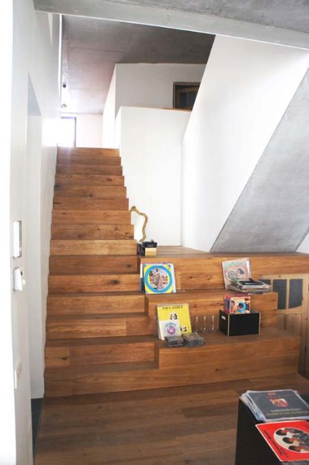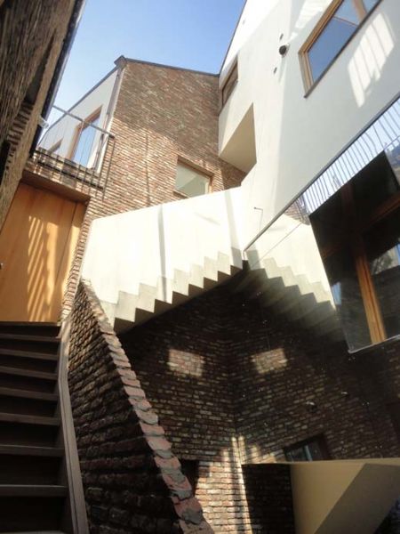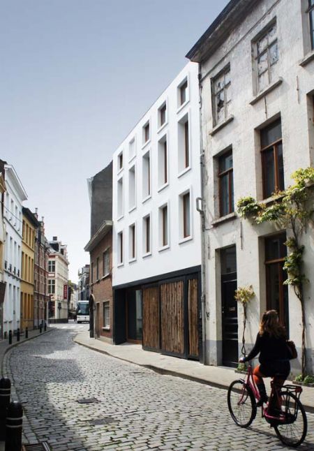 Dit gebouw verrees op de plek waar ooit een uitgebrande kostuumwinkel stond. Enkel de achtergevel is blijven staan. Het project past vier nieuwbouwappartementen zo in elkaar dat ze onder, boven en door elkaar lopen. Elk appartement kijkt zowel uit op de straat, op het binnenpleintje als op de koer, zodat er op elk moment van de dag wel ergens zonlicht binnen schijnt.