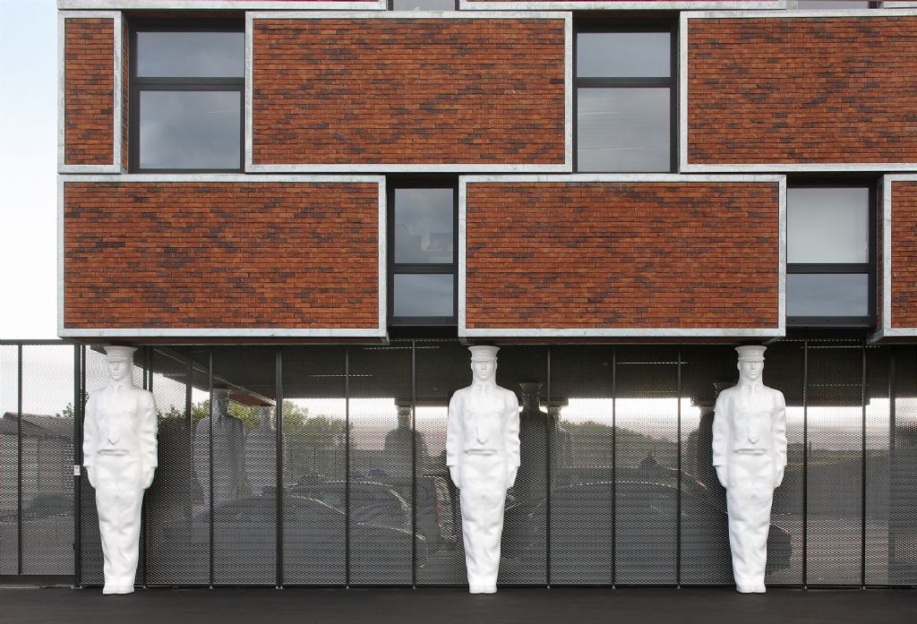 De politiemacht wordt verbeeld door het gebouw te laten dragen door ‘atlanten’: dertien beelden van politie-officiers in polyester. Ze verbergen de kolommen onder het gebouw en dienen als isolatie en bescherming. De atlanten verlenen het politiekantoor een nobele uitstraling, vergelijkbaar met de karyatiden uit de Griekse architectuur.