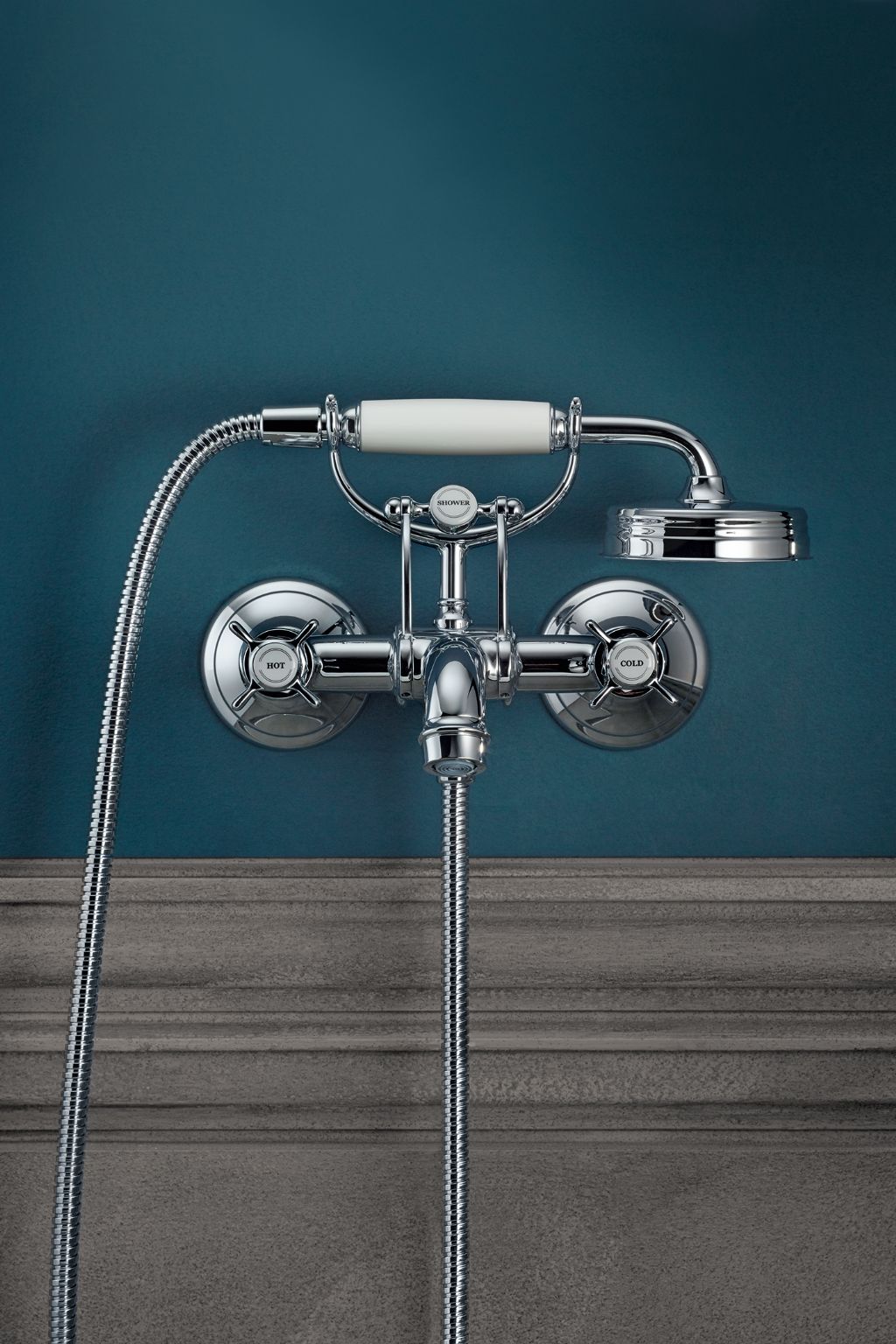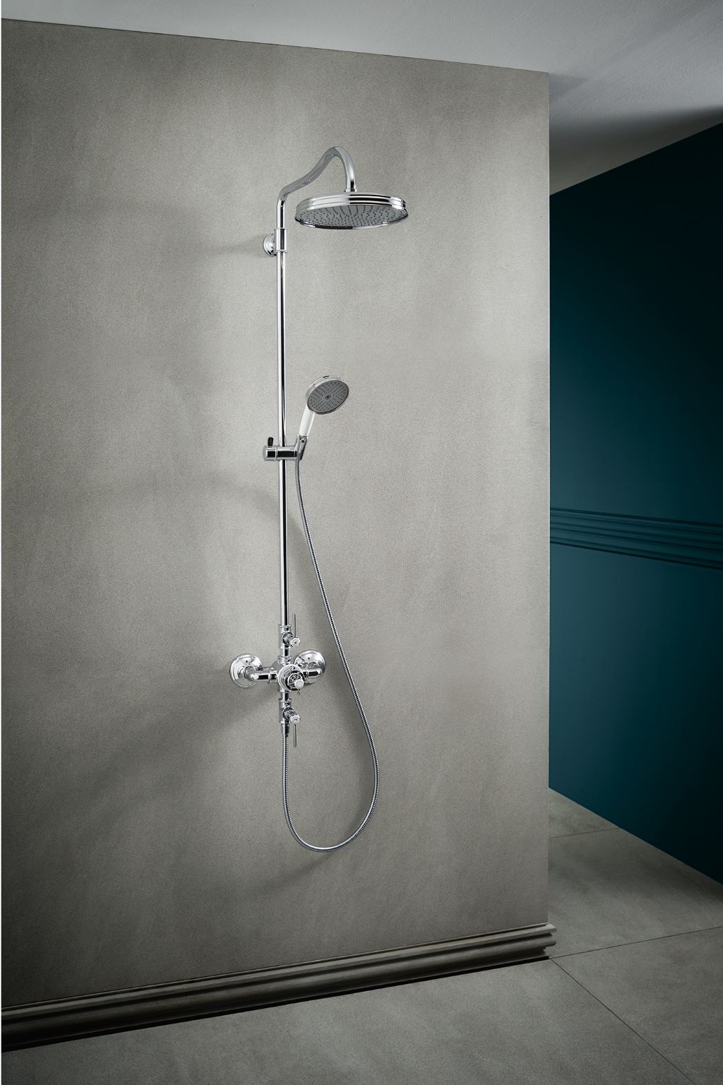 De nieuwe showerpipe met opbouwthermostaat heeft rechte grepen waarmee je in één oogopslag de hoofd- of de handdouche bedient. De porseleinen inleg zorgt voor een authentiek accent in de doucheruimte.