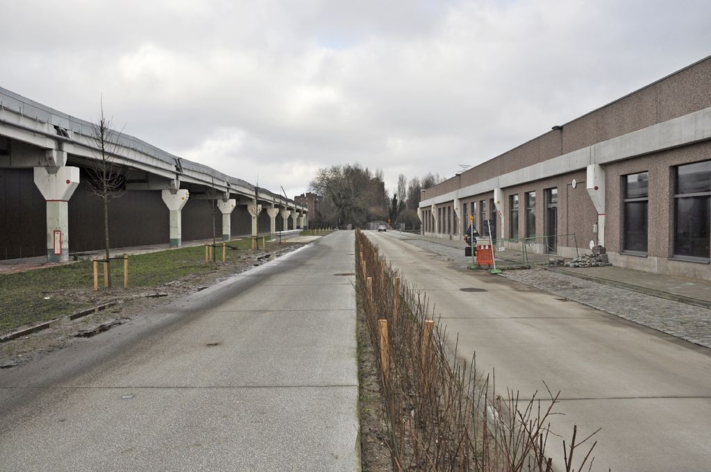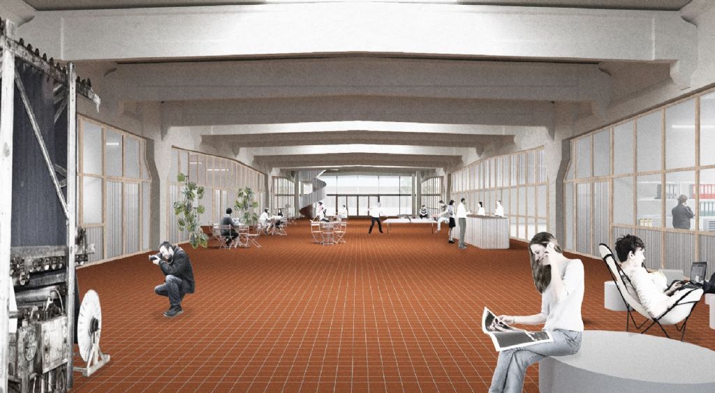 De centrale binnenstraat met zijn secundaire assen maakt het gebouw opnieuw leesbaar en verbindt zowel diverse functies als gebruikers. De gevraagde oppervlaktes worden maximaal voorzien binnen het bestaande gebouw. De noodzakelijke uitbreiding beperkt zich tot een compact accentvolume boven de nieuwe inkom. Een zuidoost gerichte colonnade ontstaat door het toevoegen van een transparante gevel achter de bestaande betonstructuur. De relatie met de overliggende hal van het in twee verdeelde fabrieksgebouw blijft bewaard.