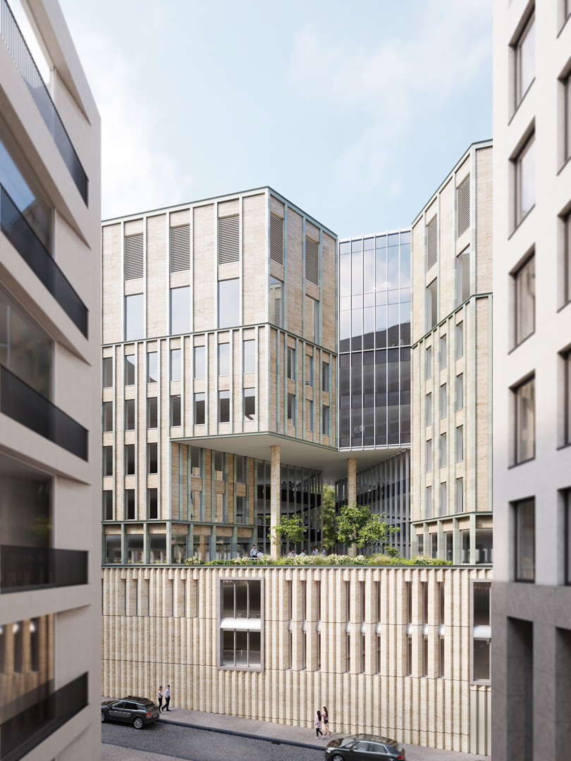 Het gebouw krijgt ook een nieuwe gevel die de visuele identiteit ervan actualiseert en volgens de architecten oud en nieuw en hoog en laag Brussel met elkaar verbindt. Deze gevel wordt bovenaan versierd met weelderig groen dat helpt de hittestress in de binnenstad te bestrijden en een welkome aanvulling vormt op de biodiversiteit. De publieke ingang is verbonden met het historische stadscentrum.