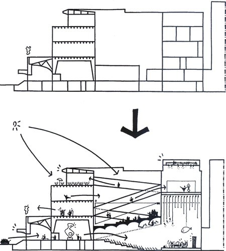 Om de relatie tussen de nieuwe cultuurfabriek en haar onmiddellijke omgeving te versterken wordt het dagcafé-restaurant aan de Witte Nonnenstraat geplaatst. Bij de voorgestelde ingrepen is er maximaal rekening gehouden met de geschiedenis van het gebouw en de bestaande structuur. Belangrijk is dat bij het omvormen van een postgebouw tot cultuurfabriek de originele structuur leesbaar en ervaarbaar blijven.