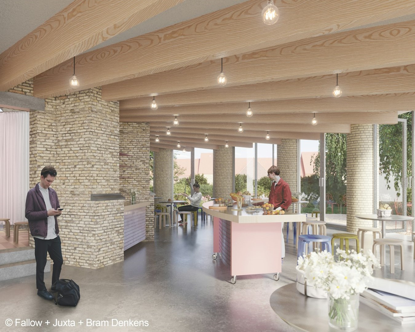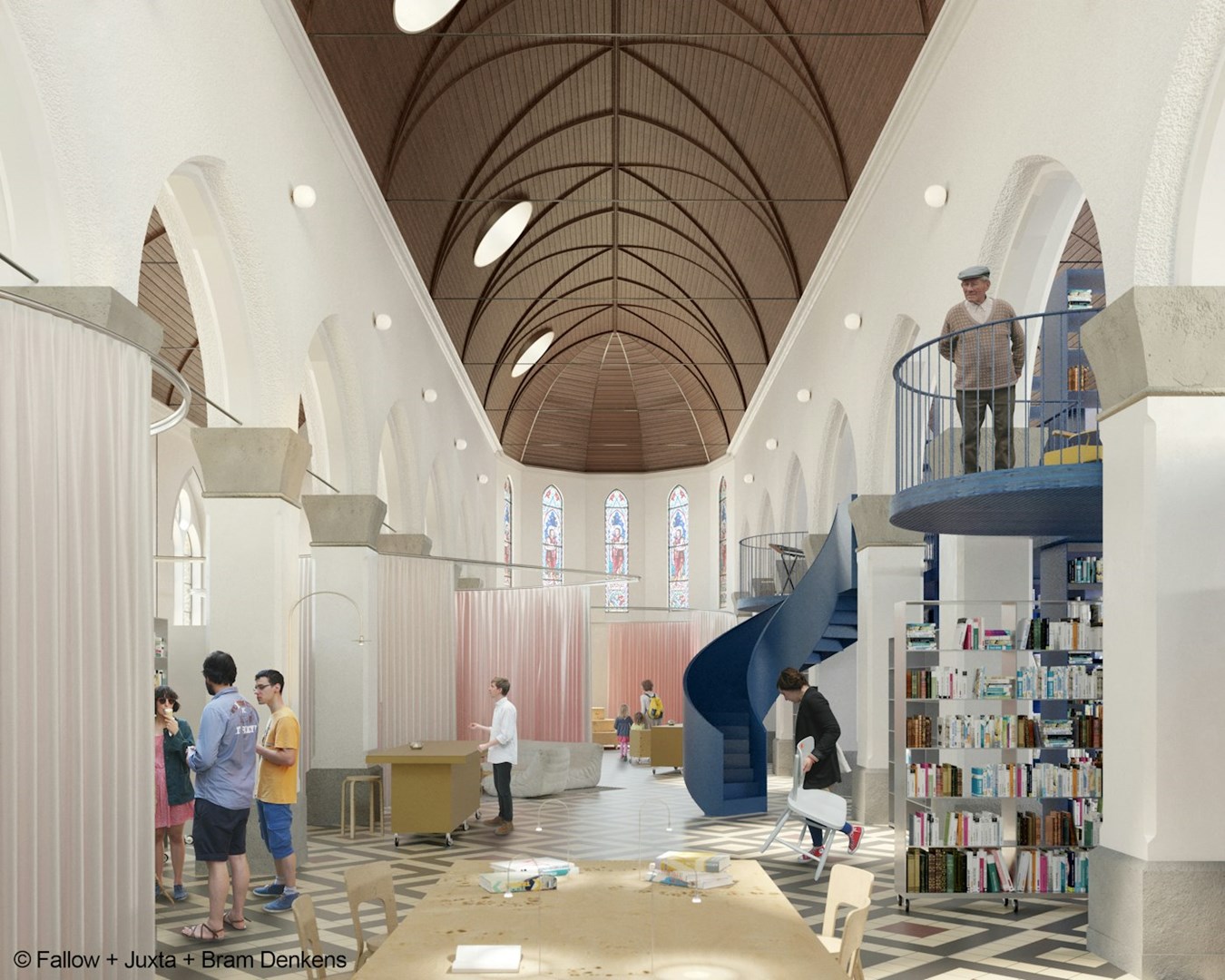 De bibliotheek van de toekomst is een open, multifunctionele ruimte die eenvoudig kan worden aangepast. Met akoestische gordijnen, boekenkasten op wieltjes, modulaire tafelsystemen en draaibare boekenplanken kan de ruimte flexibel worden opgedeeld of uitgebreid. Het leescafé krijgt een eigen plek net buiten de kerk. Door de buitenomtrek van het bestaande koor te verdubbelen met een nieuw volume, ontvouwt het gebouw zich als een waaier naar zijn omgeving – een genereus en uitnodigend gebaar.