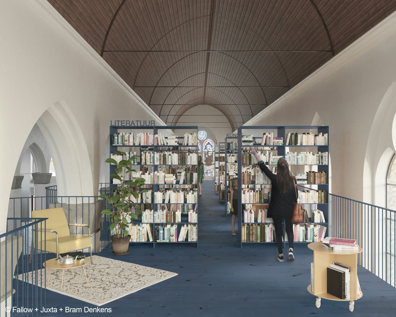 De herinrichting genereert verschillende sferen. Het middenschip en de noordelijke zijbeuk, samen met de kerktoren, vormen een open bibliotheeklandschap. Flexibele elementen maken het mogelijk om je terug te trekken in een knusse leeshoek of om de ruimte in te zetten voor lezingen en evenementen. In de zuidelijke zijbeuk wordt een lichte houten vloer toegevoegd, waarop de vaste boekenplanken geclusterd staan. Het leescafé en de voormalige sacristie worden opgevat als eigentijdse kapellen, elk met een eigen programma en een sterke meerwaarde voor de bibliotheek.
