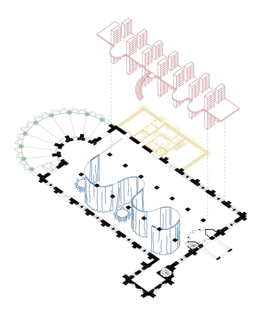 De bibliotheek wordt ondergebracht in het hoofdvolume van de kerk. Dankzij de openheid van de ruimte biedt het niet alleen plaats aan lezen en studeren, maar leent het zich ook voor polyvalent gebruik. Wanneer de kerk wordt ingezet voor grotere bijeenkomsten, kan het losse en verplaatsbare meubilair eenvoudig worden opgeborgen onder het boekenrek of in een aparte opslagruimte. Draaibare boekenplanken zorgen voor een subtiele afsluiting van de bibliotheekzone zonder de ruimtelijke samenhang te doorbreken. De openheid blijft altijd leesbaar door een doordachte toepassing van kleur en materialen, waardoor de verschillende functies naadloos in elkaar overvloeien.