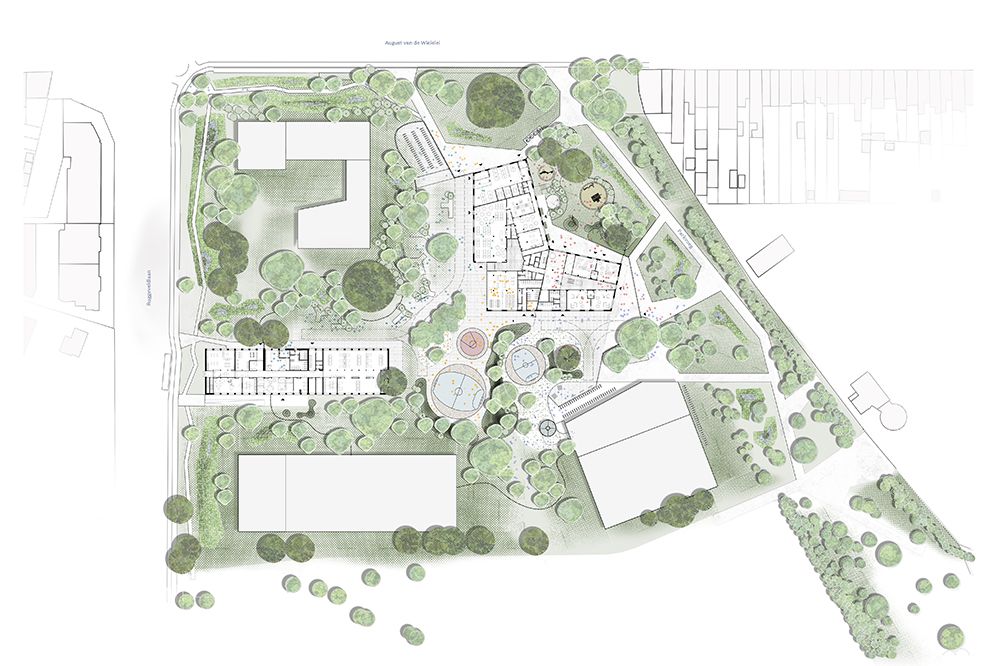 Het groene campusmodel vormt de basis voor de inplanting van gebouwen en buitenruimtes. Het park loopt door over de volledige scholencampus. De gebouwen staan in open plekken en hebben een alzijdig karakter. De voorgevels staan teruggetrokken in het groen van de parkkamer. De toegangen voor voetgangers en fietsers naar de scholen zijn comfortabele paden die aansluiten op de parklinten en de parkvoeg. Buiten de poorten, zijn die paden een onderdeel van de wandellussen en de fietsroutes doorheen het park.