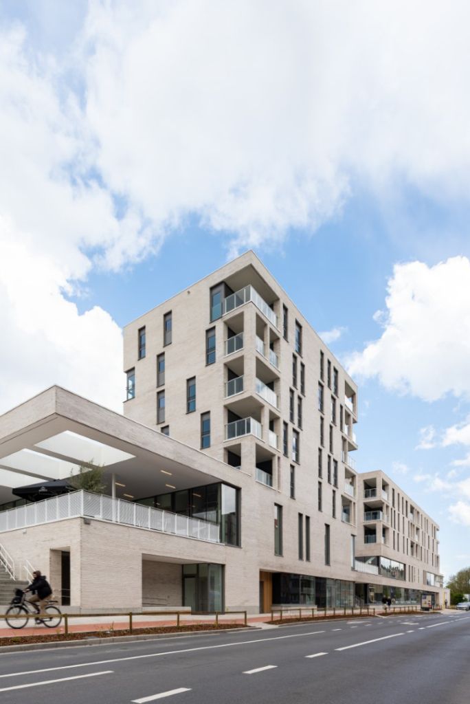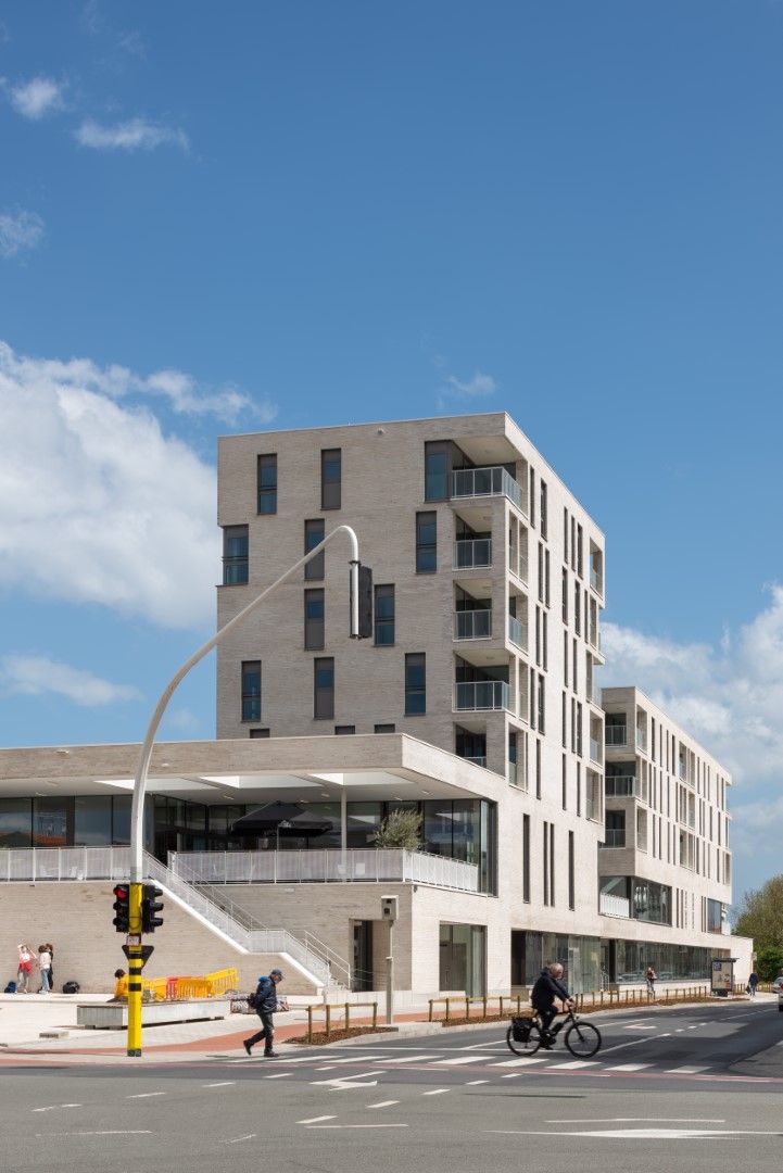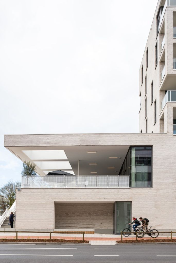 De hoofdvorm van het gebouw is een heldere vertaling van de gevraagde ruimtes, inclusief parking en appartementen. Een eenduidig gematerialiseerde gevel van metselwerk en beton smeedt de verschillende functies tot een eenheid.