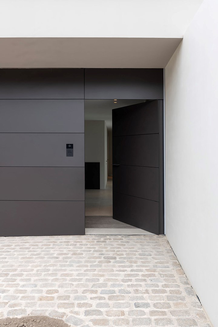 Bovendien kunnen buitendeuren en garagepoorten perfect worden bekleed met hetzelfde materiaal als gevels, waardoor ze opgaan in een strakke en doorlopende gevel. Hierdoor zijn deuren en garagepoorten vrijwel onzichtbaar geïntegreerd in een minimalistische bekleding, die enkel wordt onderbroken door een subtiele inliggende schaduwvoeg, wat bijdraagt aan een sfeervolle en harmonieuze uitstraling.