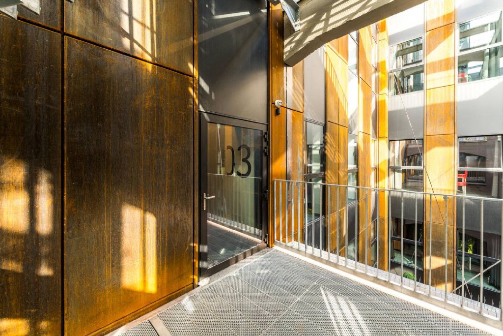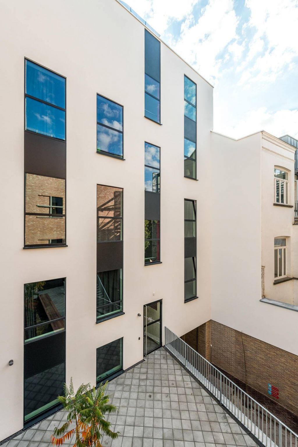 Het oorspronkelijke atrium van de drukkerij, in het midden van het industriële pand, werd opnieuw vrijgemaakt. De studentenkamers bevinden zich in een U-vorm rond deze patio. Het openbreken van de zuidgevel naar de patio toe brengt licht en lucht tot in het midden van het omvangrijke bouwvolume. Loopbruggen op elke verdieping dragen bij aan de veiligheid en beleving van het complex. De nieuwe gevels van het industrieel complex zijnbekleed met weervast staal.