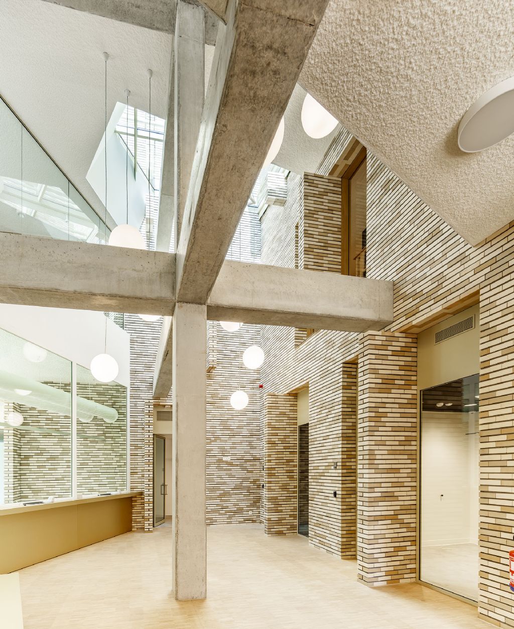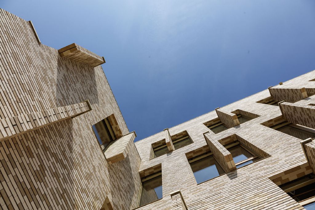 De bakstenen vinnen geven ritme aan de grote muren en het metselwerk. Dezelfde vinnen bevinden zich ook binnen, wat een link interieur-exterieur creëert en toelaat gemakkelijk te voelen in welk van de vier volumes men zich bevindt: interieur en exterieur worden elkaars spiegelbeeld. De vinnen dienen ook als zonwering, bescherming bij brand en als visuele barrière. Grote atria laten het licht doordringen tot in het hart van het gebouw.