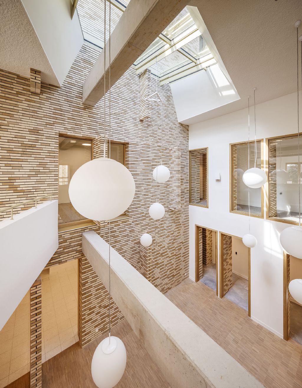 In deze nieuwe realisatie krijgt baksteen een glansrol, zowel voor de gevel als binnenin. Het zeer nauwkeurig uitgevoerde metselwerk verdient ook een extra vermelding. Het metselwerk combineert drie verschillende strengpersstenen met terugliggende voegen.