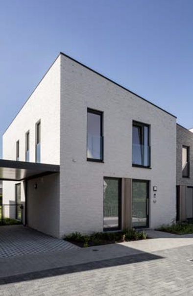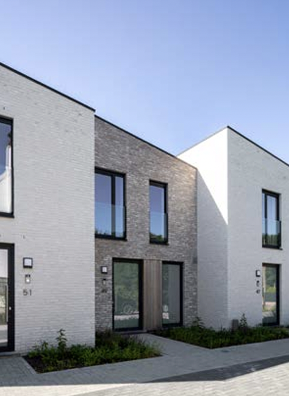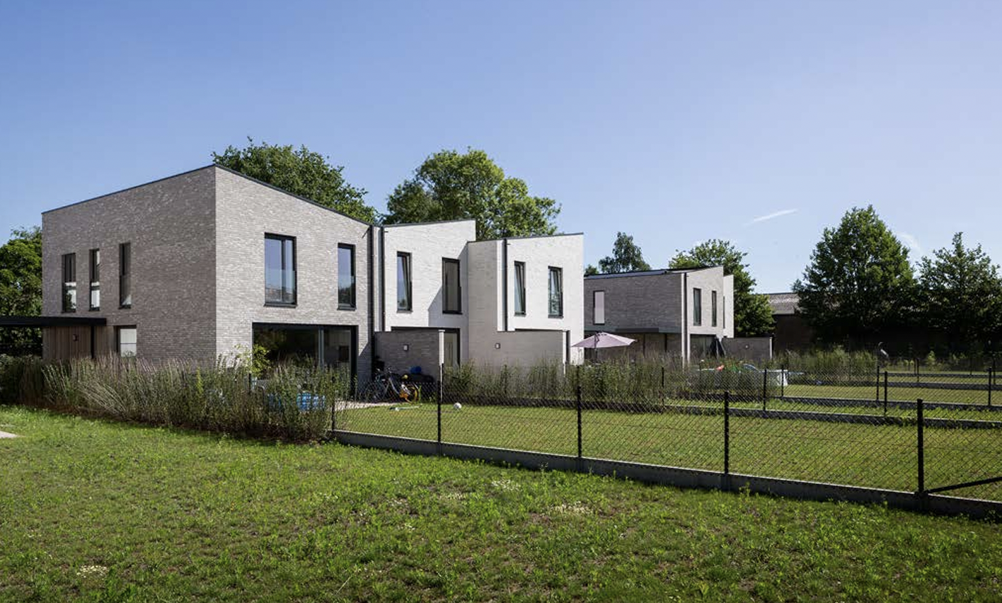 Ten eerste groepeerde a154 architecten de woningen in kleine subgroepen van 2 tot 3 eenheden, om te voorkomen dat er een groot monolithisch woonblok ontstond. Vervolgens werden de woningen ten opzichte van elkaar verschoven, waardoor de individualiteit van elk van hen werd versterkt en daarmee het grootschalige projecteffect verder werd doorbroken. Tot slot zorgden de verschillende oriëntaties van de lessenaarsdaken voor hoogteverschillen en accentueren de differentiatie nog verder. De materiaalkeuze zorgt voor de final touch om elke woning een eigen identiteit te geven. De gevel wisselt af tussen twee tinten baksteenmetselwerk met eigen kleur voegwerk en houten gevelbekleding. Alles kwam samen tot een uniek geheel in Beervelde.