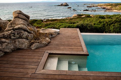 - Hout rond zwembaden – antislip en bestand tegen chloor/zout.