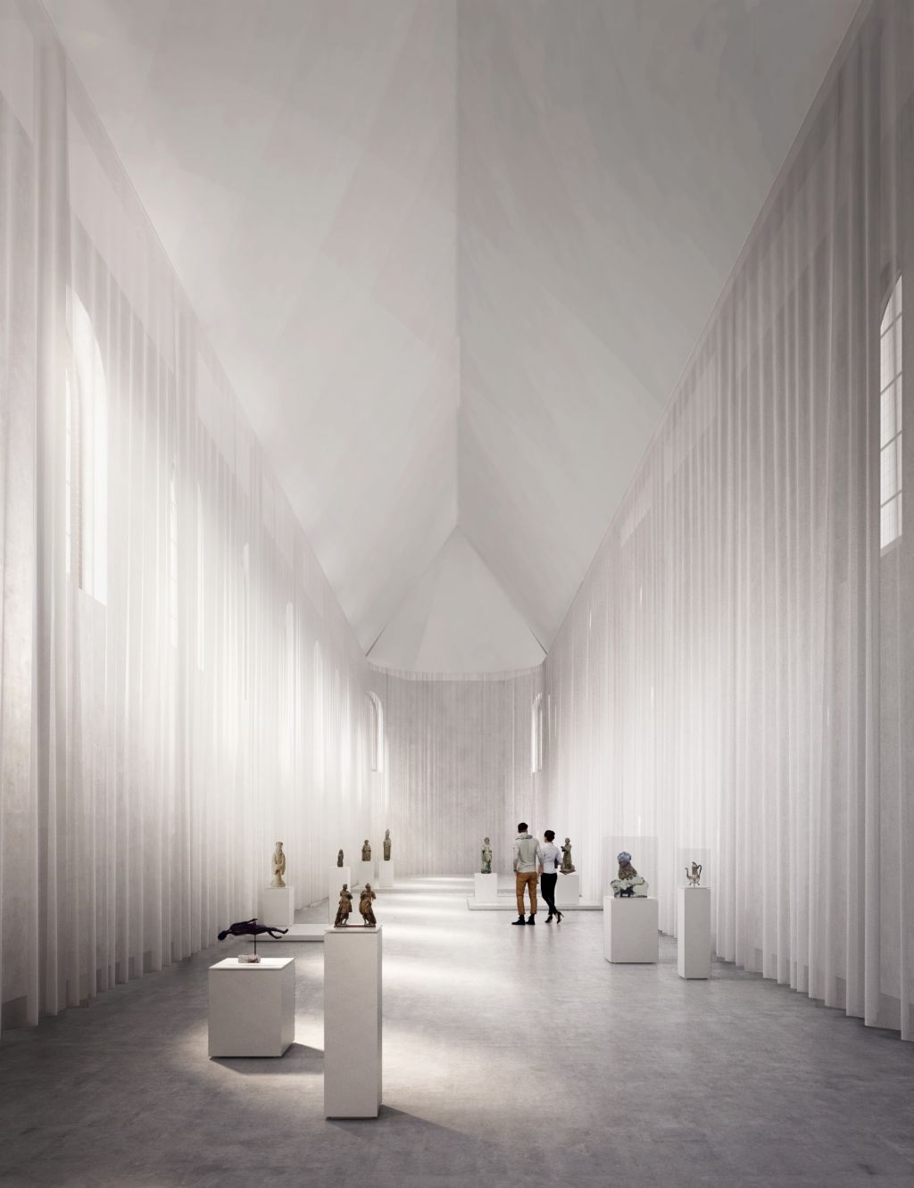 Een nieuw toegevoegde centrale circulatie zorgt voor een efficiënte organisatie van de site en verbindt zowel de bestaande als nieuwe ruimtes op een heldere manier. Naast de ondergrondse zalen voor tijdelijke exposities wordt ook de kapel ‘hersteld’ en ingezet als een tentoonstellingsruimte, wordt er een creatief atelier voorzien en ruimtes voor meer permanente tentoonstelling, ontmoeting en ontdekking.