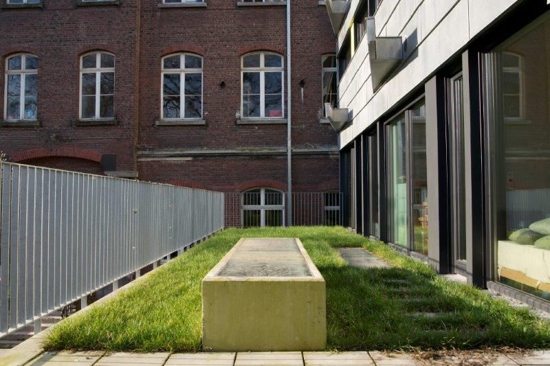 Kortom: De Vier Winden is in vele opzichten een voorbeeldgebouw. Absolute kers op de taart was de realisatie van een nieuwe sporthal op de derde verdieping. “Een apart verhaal,” aldus Thienpondt. “Toen bleek dat de Franstalige afdeling van de school zou verhuizen, kwam de derde verdieping plots volledig vrij. Samen met het schoolbestuur zijn we dan tot de conclusie gekomen dat we ze best zouden omvormen tot een sportinfrastructuur. Met behulp van stalen portieken hebben we bovenop de bestaande betonstructuur een extra verdieping gecreëerd. Dankzij een intelligent toegangscontrolesysteem is de sporthal – net als de polyvalente zaal op het gelijkvloers – na de schooluren toegankelijk voor derden.” Een ander typerend element is de nieuwe betonluifel op de speelplaats, die aan de bovenkant is uitgerust met een groendak. Deze (deels intensieve, deels extensieve) daktuin vormt een rustpunt in de ingesloten buitenruimte van de school.