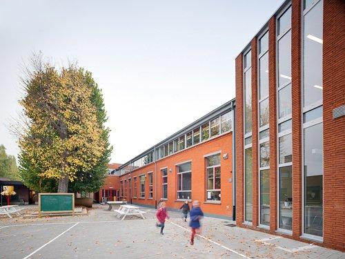 Er werd beslist om het oude schoolgebouw grondig aan te pakken: op de buitenmuren na werd het volledig gestript. Het zadeldak ging eraf en werd vervangen door een halfrond boogdak. Op die manier werd op de bovenverdieping de ruimte gewonnen voor vier extra klaslokalen. Het nieuwe dak werd bekleed met zink, dat op sommige plaatsen ook op de gevel is doorgetrokken. De rest van de bestaande gevels werd rood gekaleid om te harmoniëren met de rode bakstenen van het nieuwe gedeelte.