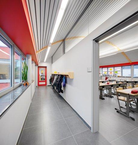 Voor de plafonds viel de keuze logischerwijze op het BL-plafond van LCC. Het gaat om metalen plafonds met open voegen waar bovenop een akoestische isolatie wordt aangebracht. Hierdoor bekomt men over een breed spectrum een goede absorptie. De BL-plafonds zijn in alle ruimtes over de volledige oppervlakte toegepast, zodat de hele school nu verzekerd is van een aangename akoestiek. Bovendien zorgen ze met een brandstabiliteit van 30 minuten ook voor de broodnodige brandveiligheid.