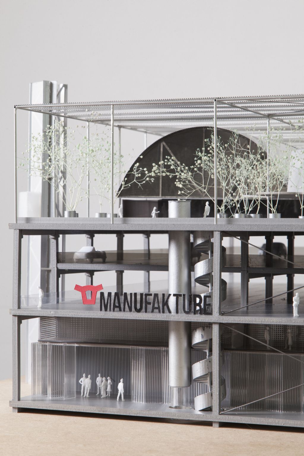 BAUKUNST besloot met een luchtig ontwerp in te spelen op de ruimtelijke uitdagingen die de geografische ligging van het nieuwe gebouw met zich meebrengt. Door zijn positie op de site maakt MANUFAKTURE het mogelijk om een nieuwe openbare ruimte te creëren en rechtstreeks met de historische hal in dialoog te treden. "Wat het ontwerp van BAUKUNST ook zo uniek maakt, is zijn extreme neutraliteit ten opzichte van de invulling wat een ongelooflijke flexibiliteit toelaat voor de toekomst. Bovendien komt er naast een belangrijke logistieke toegang tot de site, een zachte verbinding tussen de naburige wijk Birmingham en de Bergensesteenweg", aldus Abattoir.