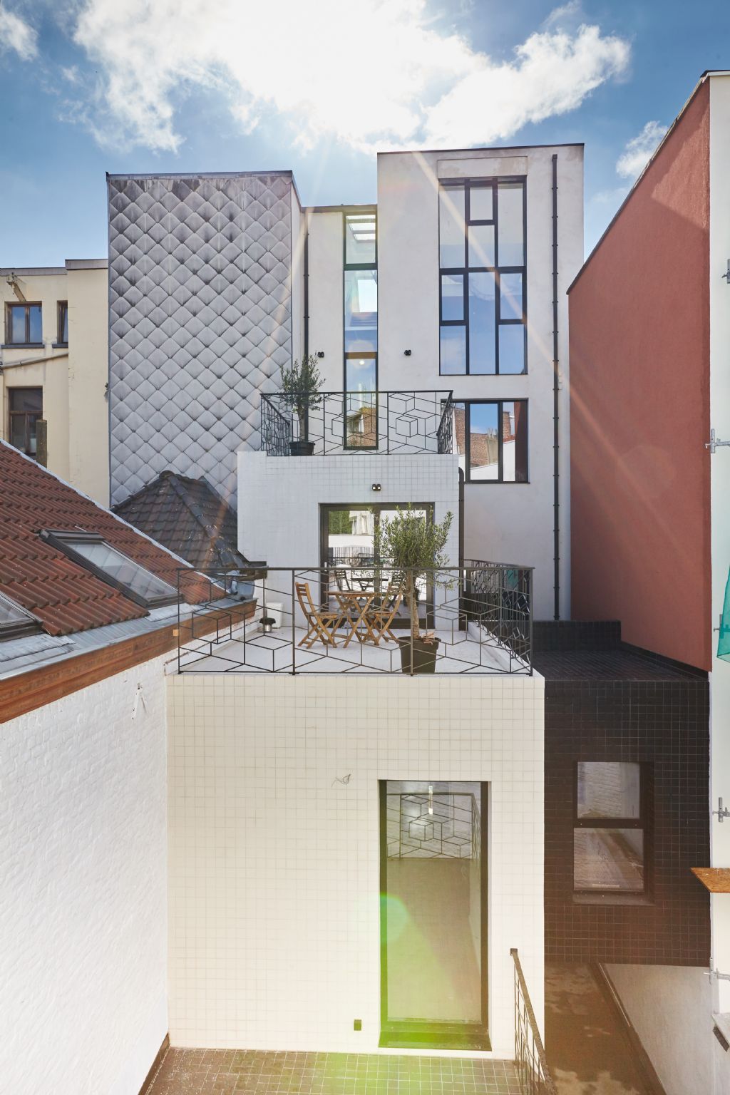 In een uiterst dichtbebouwde wijk, vlak bij het Fernand Cocqplein in Elsene, zorgen rechthoekige parallellepipedums voor een vergroting van de wooncapaciteit van een typisch Brussels huurhuis. De verloederde koterijen maakten plaats voor nieuwe volumes die wél goed geïsoleerd en luchtdicht zijn. Het geheel is opgewaardeerd op basis van de huidige technische normen en de energetische winsten worden versterkt via de doordachte dimensionering van de ramen. Deze renovatie annex uitbreiding biedt een accuraat antwoord op de vraag naar ruimtelijke verdichting en gemengd wonen in de stad. De ruimtes zijn zo ingedeeld dat de bewoners optimaal kunnen genieten van de rust in de beslotenheid van het binnengebied. De slaapkamer(s) en de leefruimte bevinden zich aan de achterkant, terwijl de open keuken met eetruimte is ingericht aan de straatzijde.