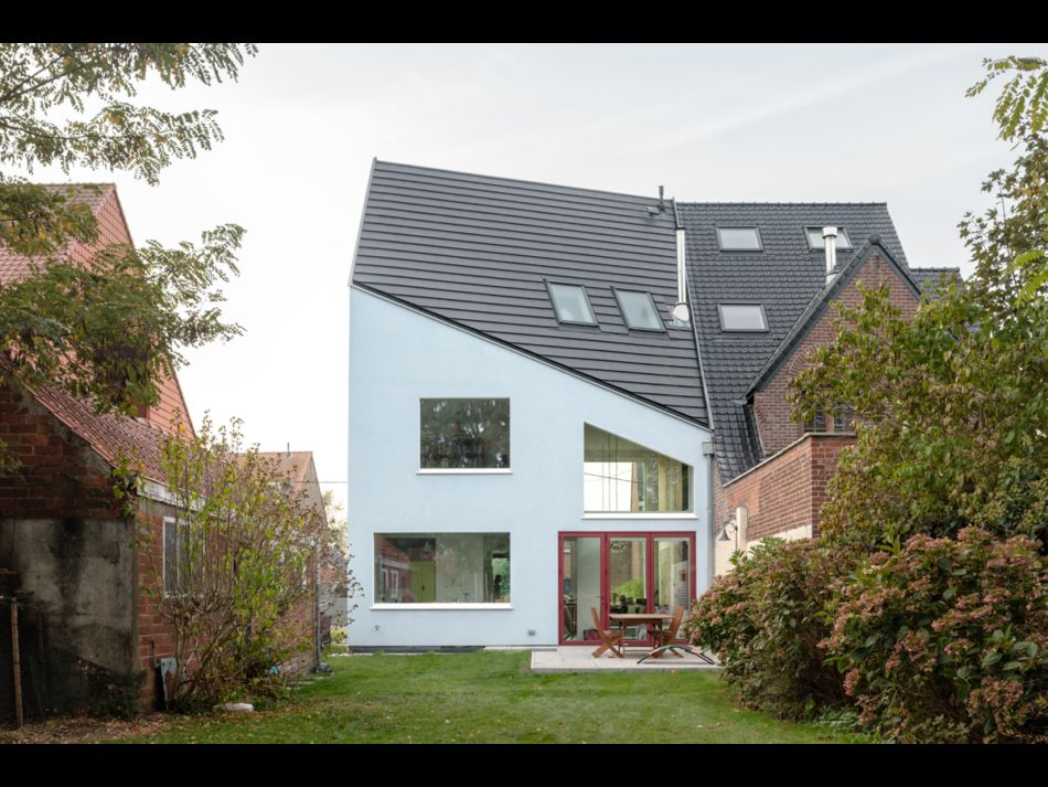 Deze klassieke zadeldakwoning in Sint-Amandsberg onderging een volledige metamorfose. De gesloten, donkere kamers in het bestaande baksteenvolume maakten plaats voor een luchtige structuur met allerlei plekjes en hoekjes. Met een minimum aan ingrepen realiseerde Tim Peeters Architecten een ‘reorganisatie van ruimtelijkheid en licht’. Het markante gevelontwerp verenigt oud en nieuw. De sobere, op maat gedetailleerde gevelopeningen van het nieuwe gedeelte volgen een strikt raster om eenheid en rust te brengen in het expressieve volume met puntgevels. Het resultaat is een flinterdunne blauwgrijze huid, ingevuld met glas, zonder kaders en een schuine witte dorpels. Deze materialisatie contrasteert met het gewichtige baksteenfront, dat lichtjes naar voren geschoven is, als een tastbaar souvenir uit het verleden. De grote raampartijen zorgen voor een intens contact met de buitenwereld.