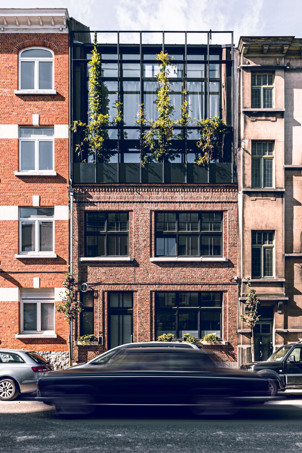 In een residentiële wijk in Elsene is een pand uit 1928 gerenoveerd en uitgebreid tot een ruimere eengezinswoning met een grotere natuurlijke lichtinval. EDA-AU werd geconfronteerd met een ondiep perceel en een omgeving waarin massieve materialen de boventoon voeren. Het ontwierp een ophoging met een grote beglaasde façade, die 70 cm teruggetrokken is ten opzichte van de rest van de gevel. Ter hoogte van de rooilijn plaatsten de architecten een staalstructuur die klimplanten ondersteunt. Deze bijzondere combinatie waarborgt niet alleen de privacy, maar gaat ook oververhitting tegen. Via de integratie van een lichtkoepel is de donkere gang omgetoverd tot een volwaardige circulatieruimte die op alle verdiepingen baadt in het licht. De achtergevel werd op een iets conventionelere manier onder handen genomen, al zijn de raamopeningen in het bestaande gedeelte volledig herschikt en is er voortaan sprake van een erg grote raampartij op de vierde verdieping (aan de tuinkant).