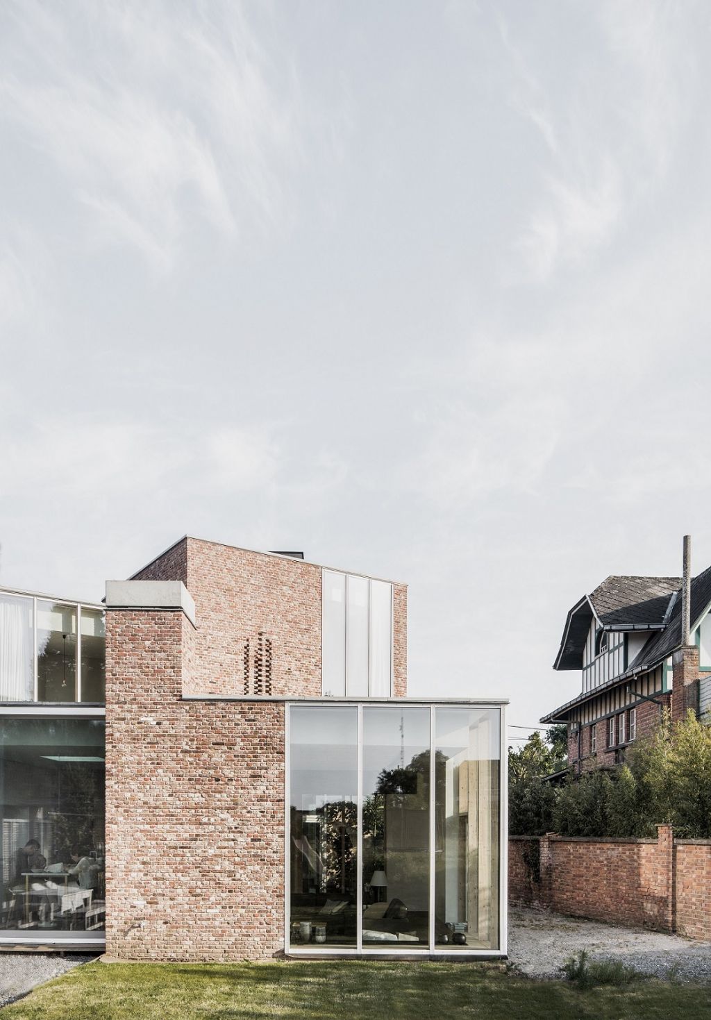 In een pittoreske dreef in Anzegem realiseerde GRAUX & BAEYENS architecten een bijzondere halfopen woning. Het trapeziumvormige perceel bevindt zich op de overgang tussen typisch Vlaamse lintbebouwing en vrijstaande belle-epoquearchitectuur. Als missing link moest de woning een vloeiende visuele overgang creëren. Dit resulteerde in een compositie van drie geschakelde kubussen met een plat dak en variërende kroonlijsthoogtes. Onderling zijn deze vierkanten volumes telkens met één hoek verbonden. Dit leidt tot een doordachte ‘zigzagbeweging’, waardoor er eveneens plaats is voor een volwaardige zijtuin. Alle buitengevels zijn opgebouwd uit karaktervolle, gerecupereerde bakstenen. De houten blokkaders met aluminium glaslatten doorbreken de massieve monotonie. Ook de geanimeerde zijgevel maakt deel uit van het straatbeeld.