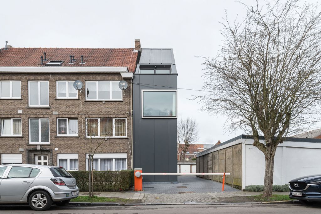 Zelfs op de meest krappe (rest)percelen kan architecturale creativiteit wonderen doen. Dat bewijst deze ‘slanke’ woning van Architectuuratelier Dertien12 in Wondelgem, die het concept ‘optimaal ruimtegebruik’ een nieuwe dimensie geeft. Gezien de doorrit naar enkele achterliggende garageboxen was er sprake van een bebouwbare breedte van 3 meter en een wachtgevel van 14 meter hoog. De woning staat met haar rug tegen de bestaande wachtgevel, waardoor de overige gevels volop in interactie kunnen treden met de omgeving. Hierdoor genieten de bewoners op alle verdiepingen van een ongebreideld uitzicht en verrassend en gevarieerd (zon)licht. De centrale trap beweegt zich op een compacte manier door de open splitlevels en rijgt zo alle ruimtes aan elkaar. Ook de rest van de straat heeft baat bij dit markante nieuwbouwproject. De wachtgevel van weleer wordt aan het zicht onttrokken door een smalle, geanimeerde woonst met variabele raamopeningen.