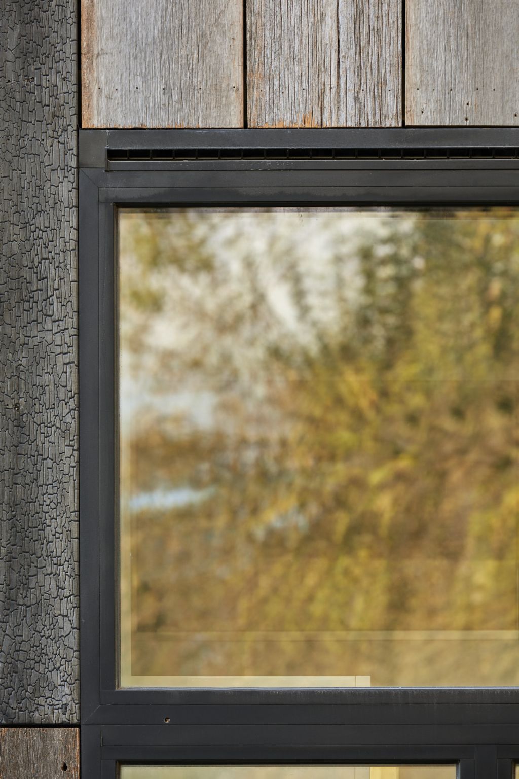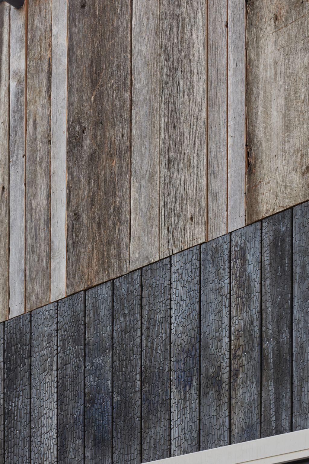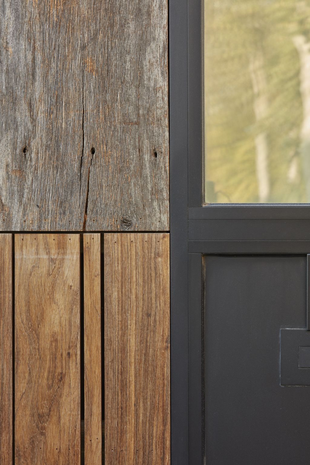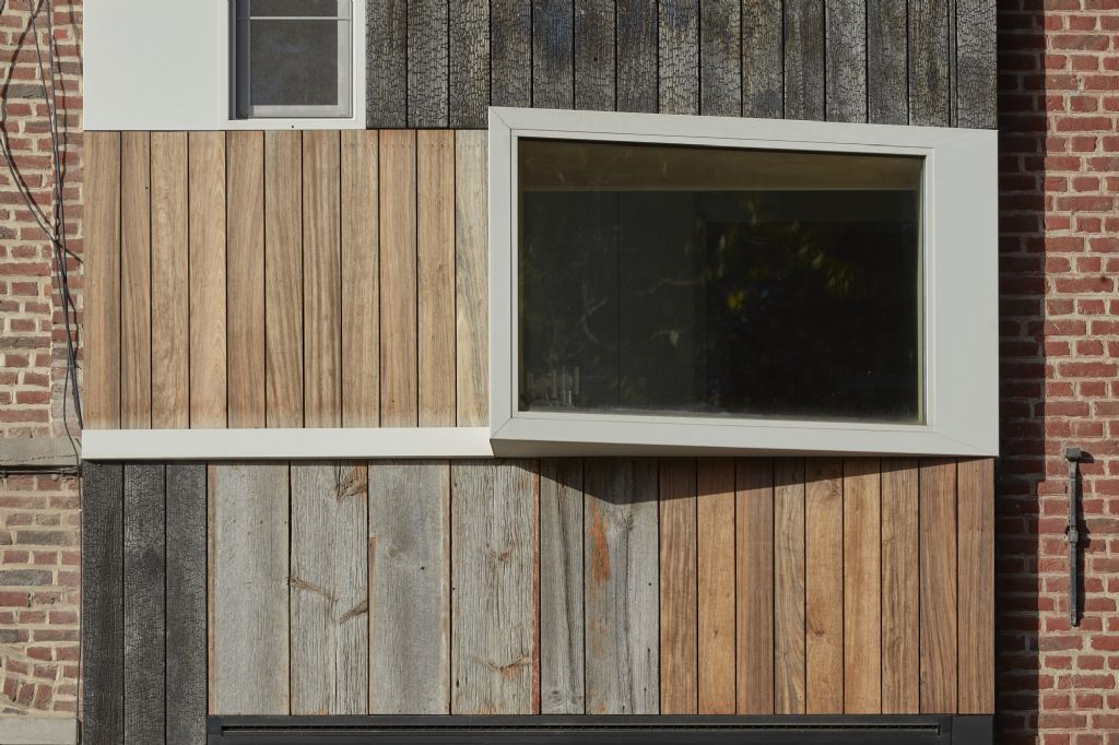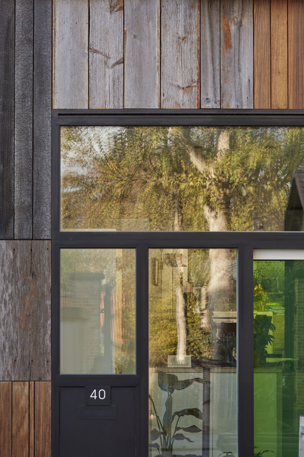 De gevel speelt een spel van open- en geslotenheid en vormt als het ware een ‘kijkoog’ aan de straatzijde. De voorgevel werd uitgewerkt in drie houtsoorten in een grijszwarte kleur met een aantal witte elementen: de inkomschuifdeur, het kijkoog met lijstvoorzetting, het kleine raam. Dankzij de combinatie van drie houttexturen ontstaat een subtiele gevel die zich op vanop afstand of dichtbij helemaal anders laat lezen.