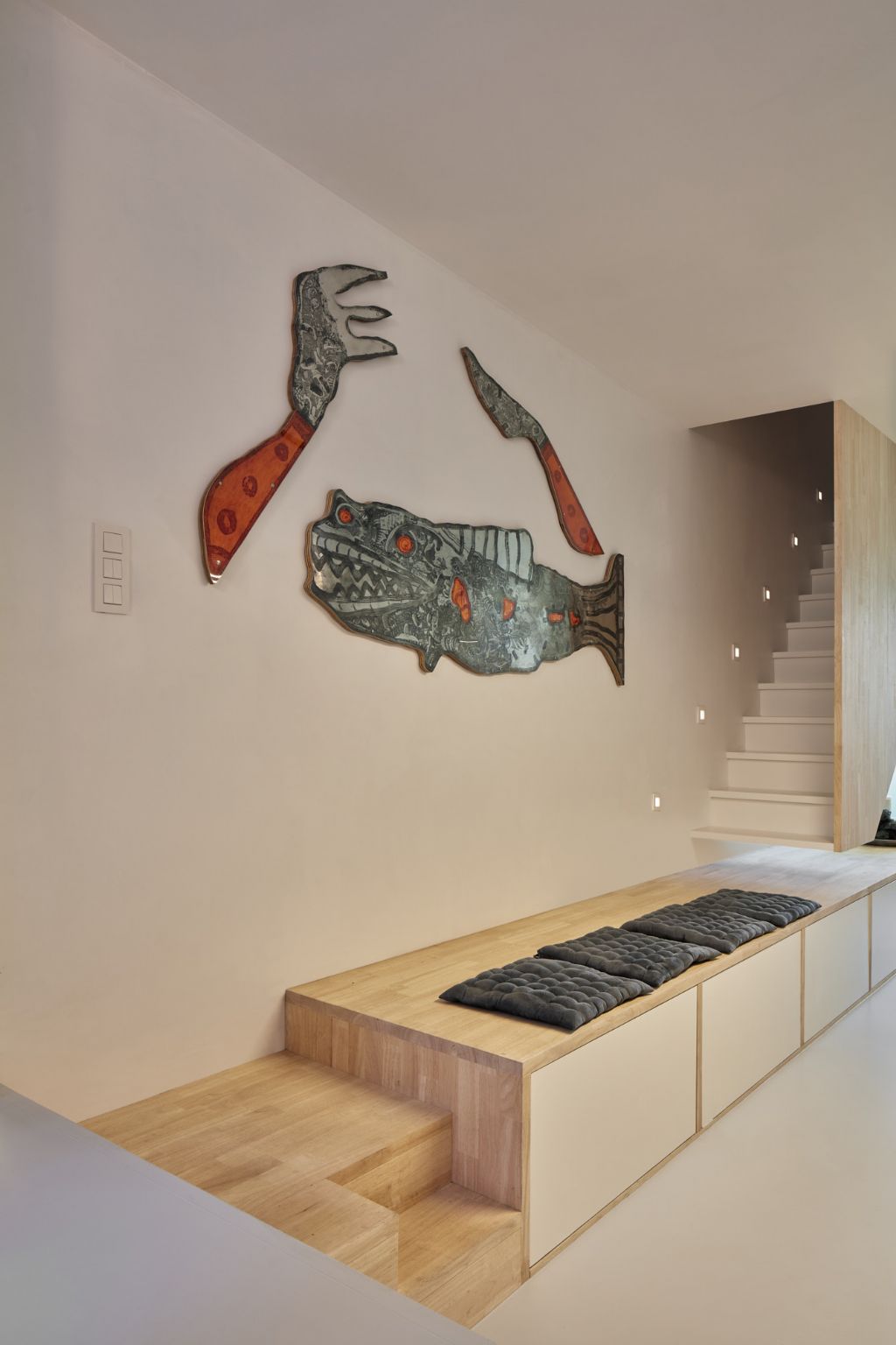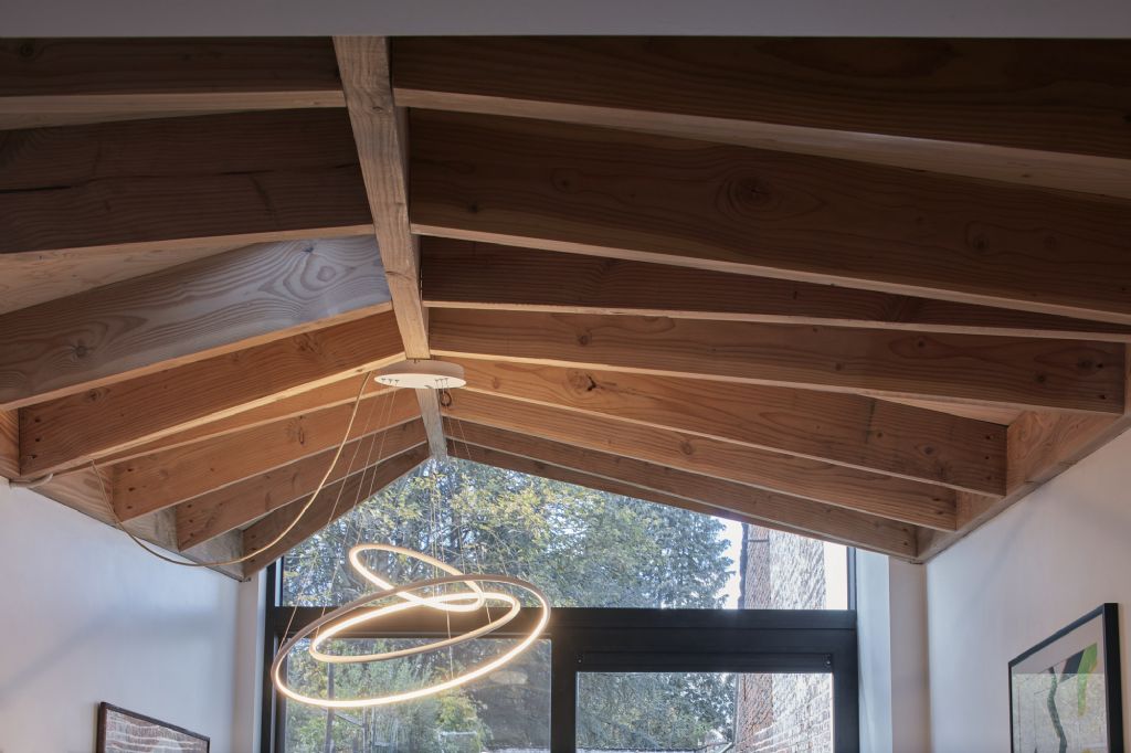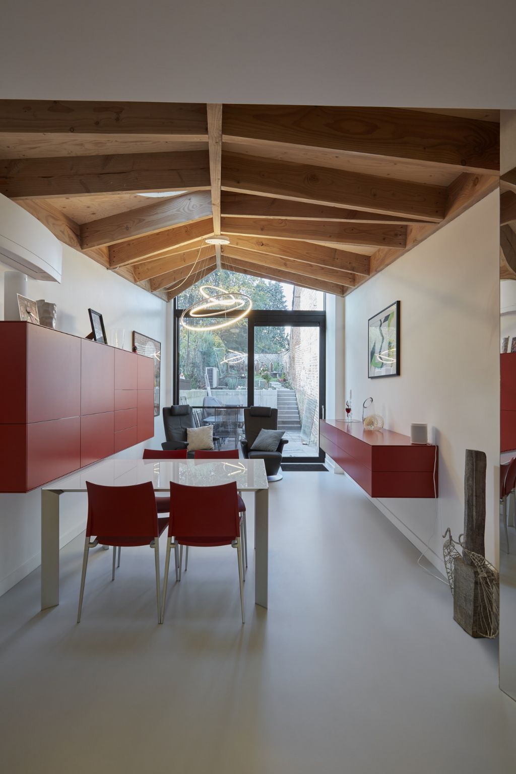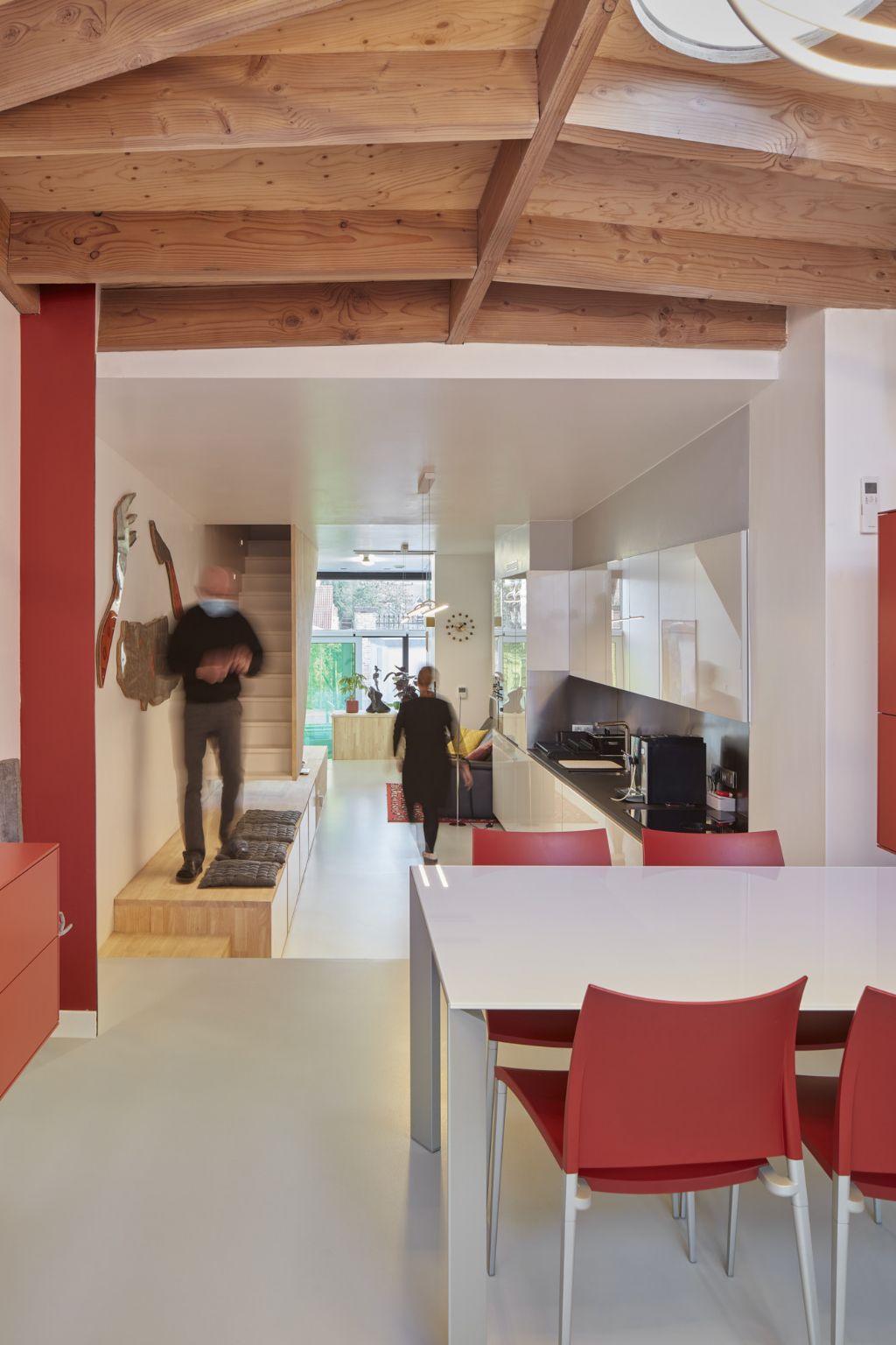 De woning werd volledig opengesneden tot een open ruimte met zicht van in de Kruidtuin tot op de heuvelflank van de tuin. De woning maakt gebruik van verschillende sprongen om zo tot op patiohoogte te reiken en finaal naar de tuin te leiden. Het houten plafond van de doorgaande ruimte plooit zich dubbel asymmetrisch omhoog naar de tuin. De blik wordt zo omhoog gericht waardoor de bewoners een open gevoel krijgen waarbij de Kruidtuin en hun eigen tuin als het ware één open ruimte vormen. Het houten dak werkt tezelfdertijd als een vervormd schip en biedt geborgenheid.