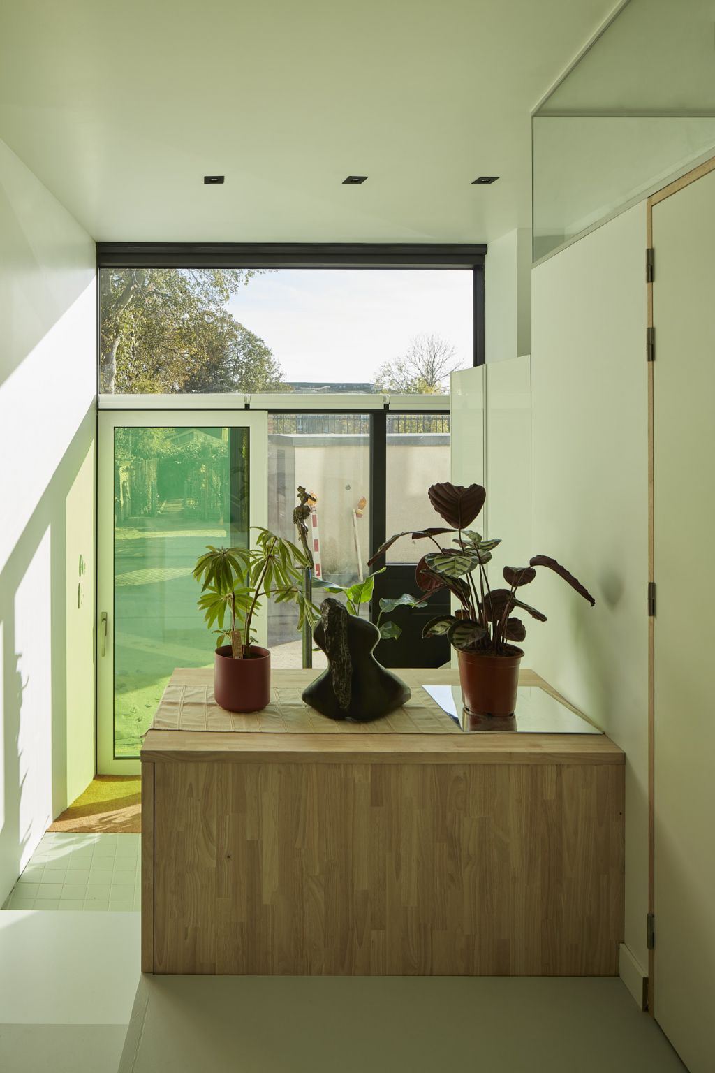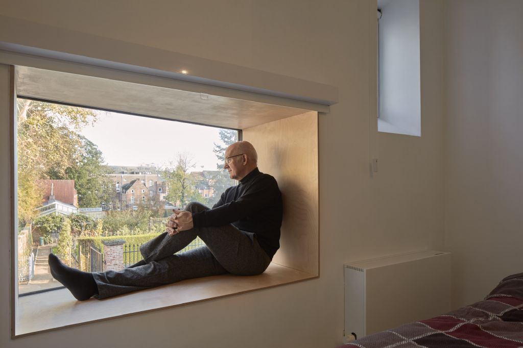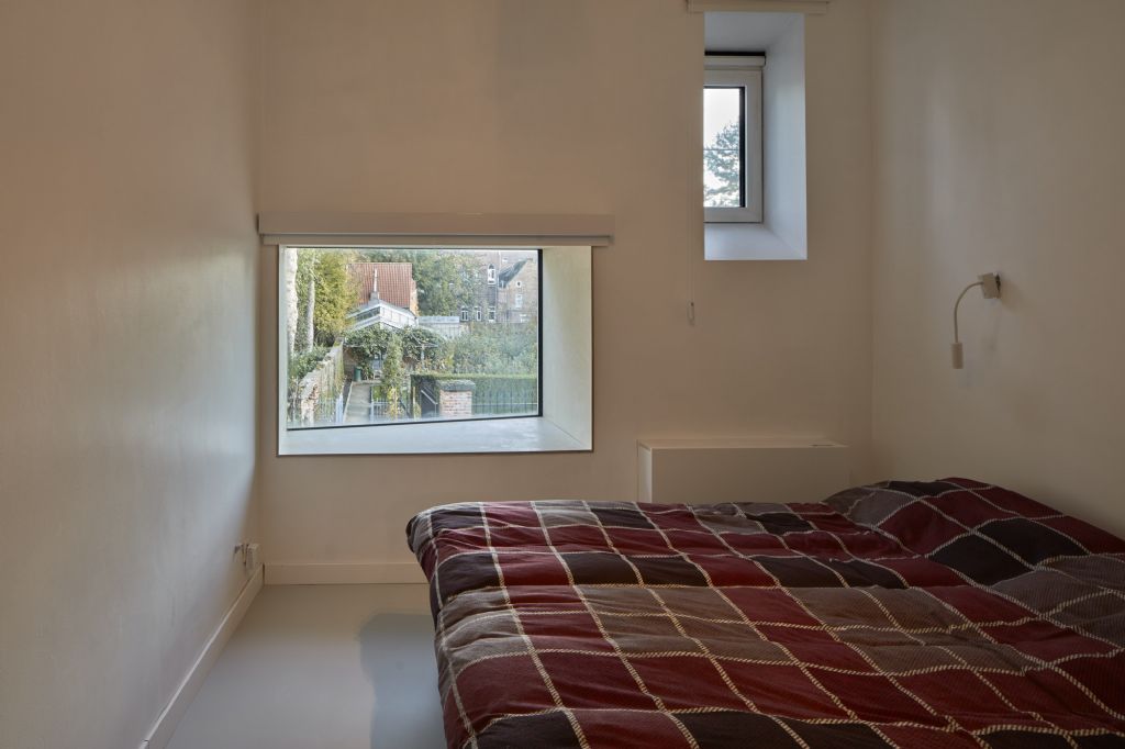 Ondanks de zeer beperkte breedte van 3,5 meter, voelt de woning erg ruim aan. In de slaapkamer zijn twee bijzondere ramen voorzien: het ‘Vermeerraam’ en het ‘cycloopraam’. Het Vermeerraam is een knipoog naar de schilderijen van Johannes Vermeer waarbij licht in de hoek van kamer van bovenaf binnenvalt op de muur parallel met de schilder. Het cycloopraam vormt een uitpuilend oog dat zich naar de grote bomen van de Kruidtuin draait. Hier kan je in het raam kruipen als een klein nest binnen deze woning, 5 meter zwevend boven de straat en de boomkruinen haast binnen handbereik.