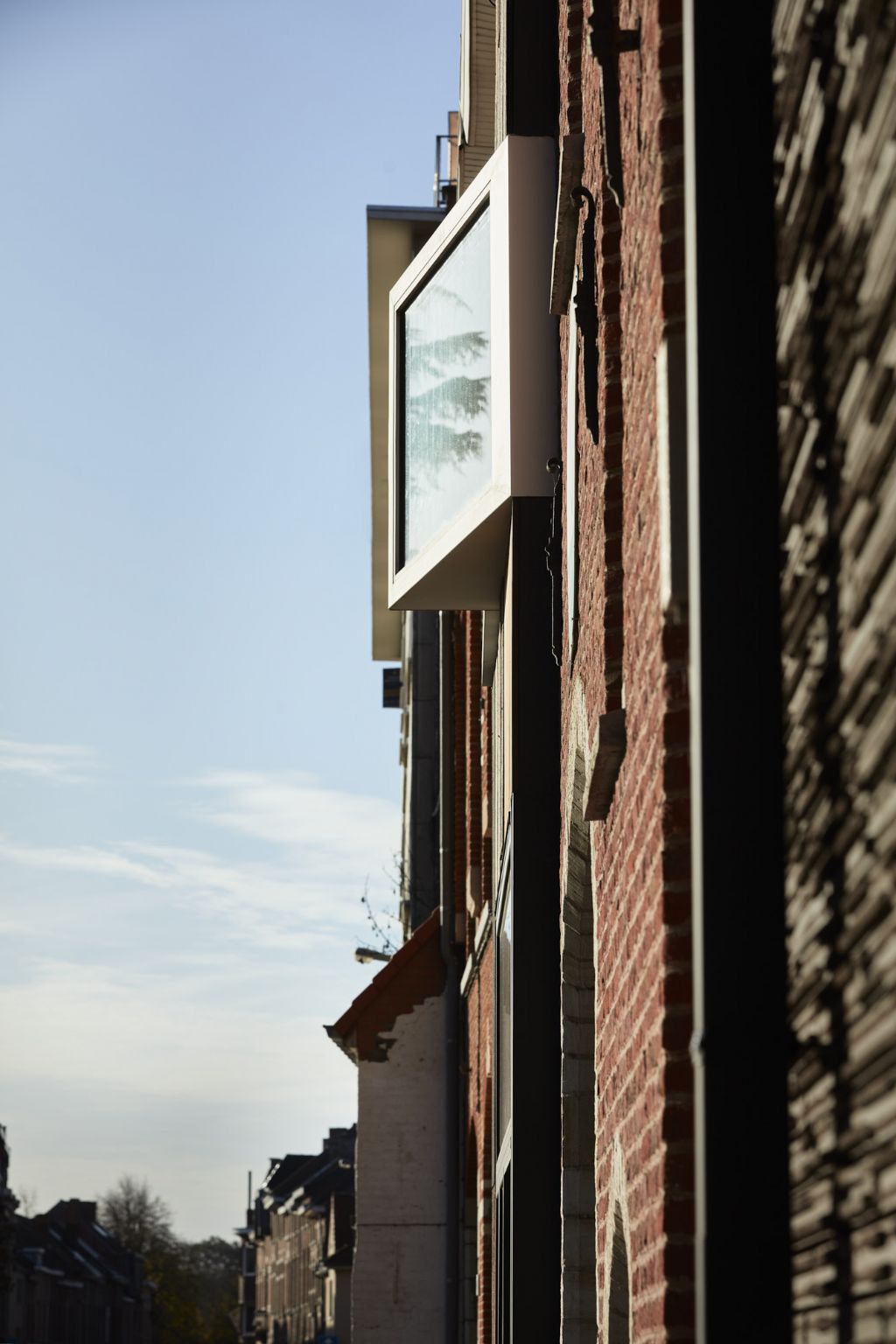 Het contact met de straat wordt sterk bevorderd door het maximaal openwerken van de voorgevel. Het groene glas en de opgaande niveauverschillen temperen de inkijk en vormen tegelijk een spiegel van de Kruidtuin. De gevel plukt bijna letterlijk uit de Kruidtuin en nestelt zich tegen zijn grote buur aan, een erfgoedpand van Joris Helleput, als een olijke tweeling: de grote rode bakstenen broer en het grijszwarte ‘klein duimpje’.
