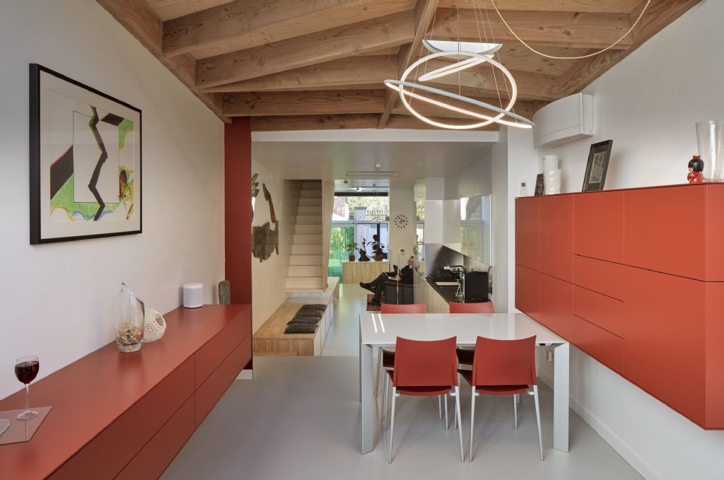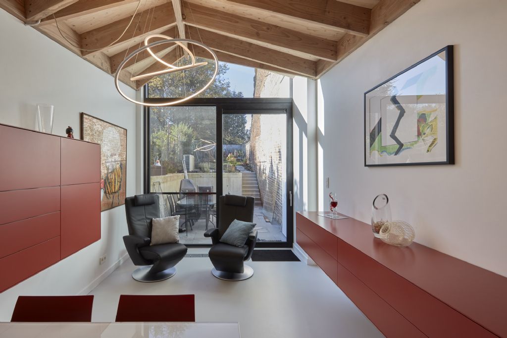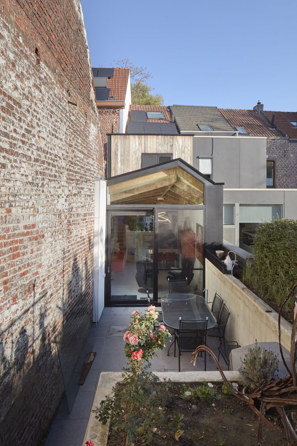 WOODFACE is gegroeid uit de vraag van een gepensioneerd koppel om een bestaande rijwoning van amper 3,5 meter breed en een tuin een volledige verdieping hoger dan het gelijkvloers, te verbouwen naar hun ‘laatste huis’. De woning biedt achteraan zicht op de prachtige Kruidtuin van Leuven en die troef speelde guerrilla office architects ten volle uit in het ontwerp.